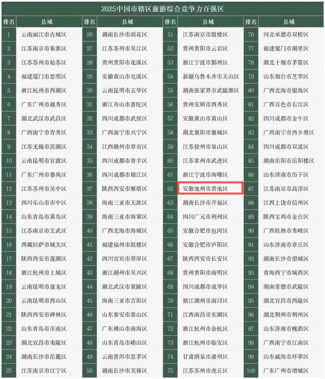 贵池入选2025中国市辖区旅游综合竞争力百强区