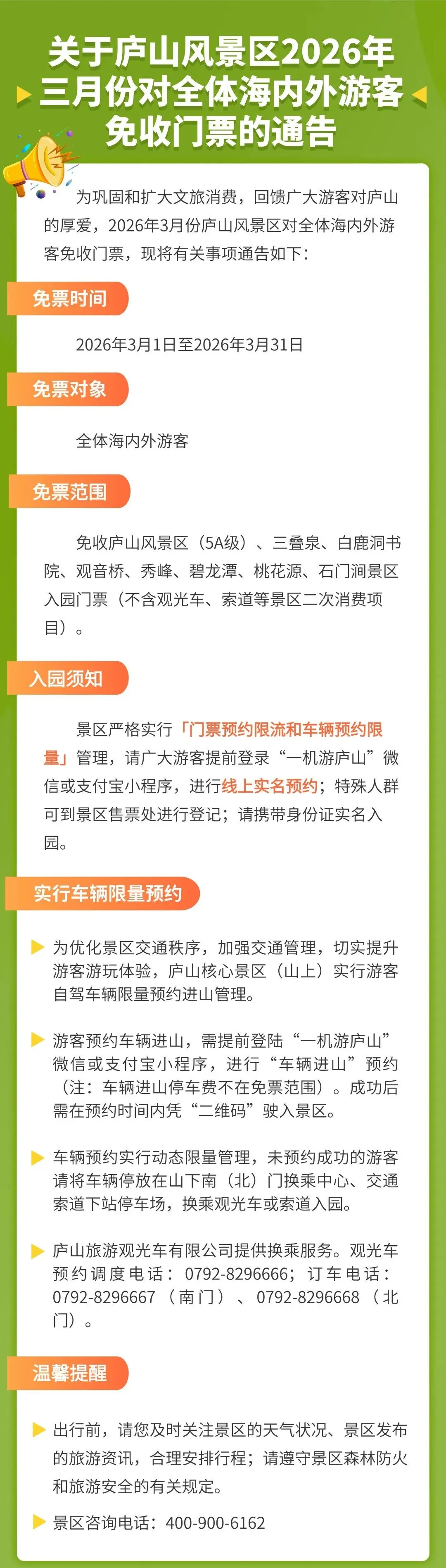 根据庐山风景区2月25日的公告,庐山风景区将于2026年3月1日至3月31日对全体海内外游客免收门票,免票范围包括庐山风景区、三叠泉、白鹿洞书院、观音桥、秀峰、碧龙潭、桃花源、石门涧景区的入园门票。据悉,平日庐山景区大门票的成人票为160元,学生票为80元。