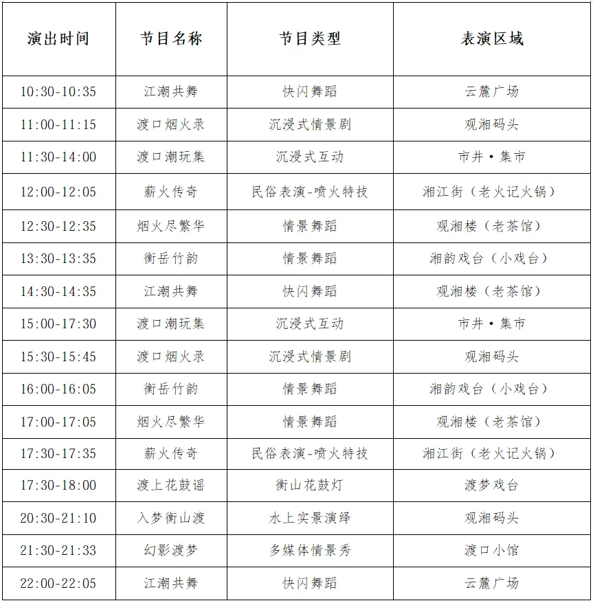 下午,衡山汇景公司组织开展衡岳竹韵情景舞蹈、渡口烟火录沉浸式情景剧、民俗表演喷火特技等活动。晚上19:00开始,在衡山渡观湘坊集合往白马坊方向,开展龙狮、皮影服装秀(老茶馆、云麓广场)巡游、表演活动,县花鼓戏剧团开展花鼓小戏、西游系列等表演,营造欢乐喜庆、吉祥如意的佳节氛围。