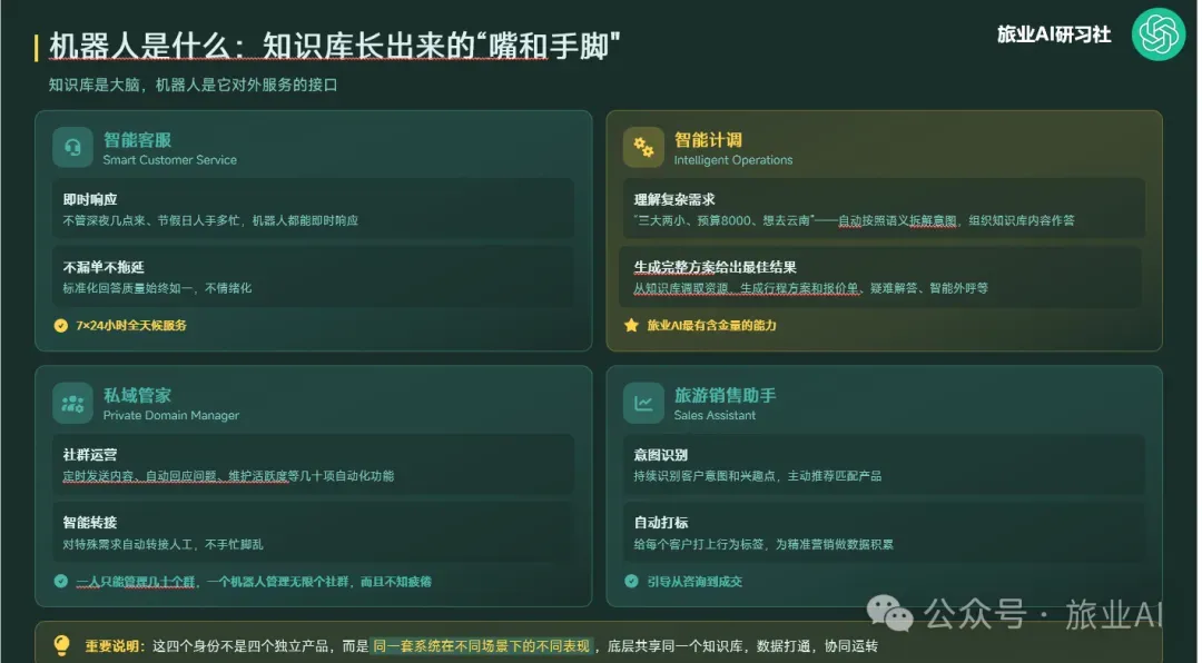 售前咨询与私域管家: 基于我们的旅业AI知识库+微信机器人,它懂线路、懂政策、懂客户心理。无论半夜三点还是高峰期,它都能即时答疑,并根据私域画像精准推送产品 。