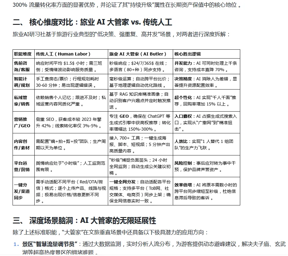 智能计调/规划 手工查房态/票价;行程规划耗时 30-60 分钟;易出现逻辑错误 。 毫秒级运算;自动跨平台比价;基于地理逻辑自动优化路线 。 决策精度:AI 消除人为差错,显著提升资源配置效率 。