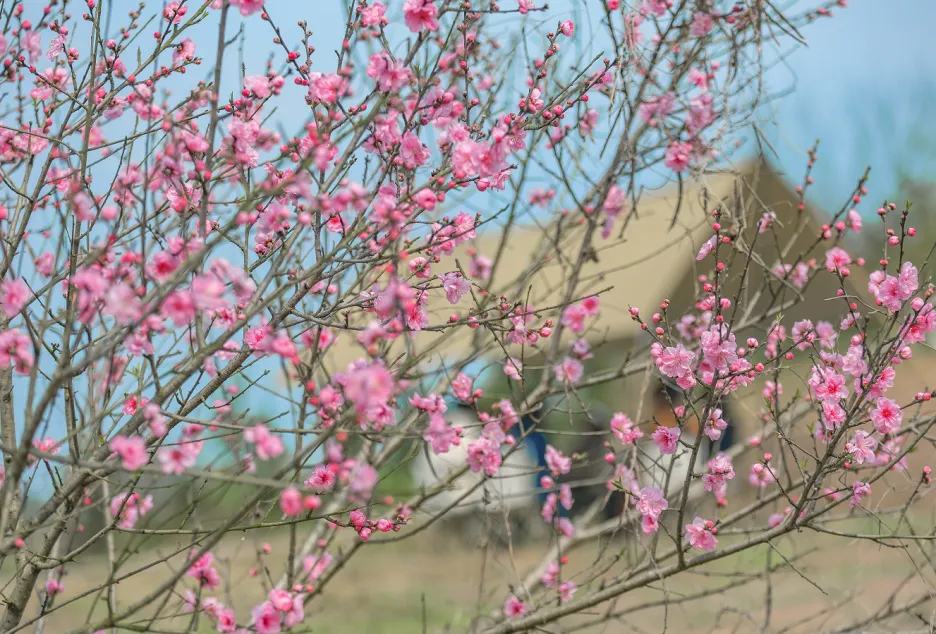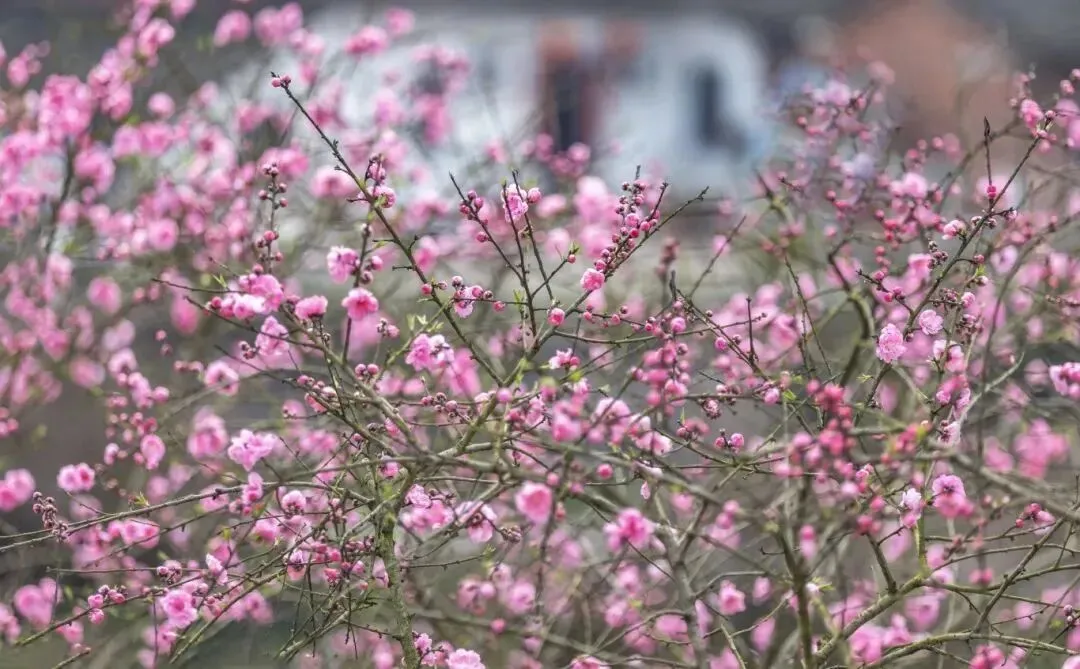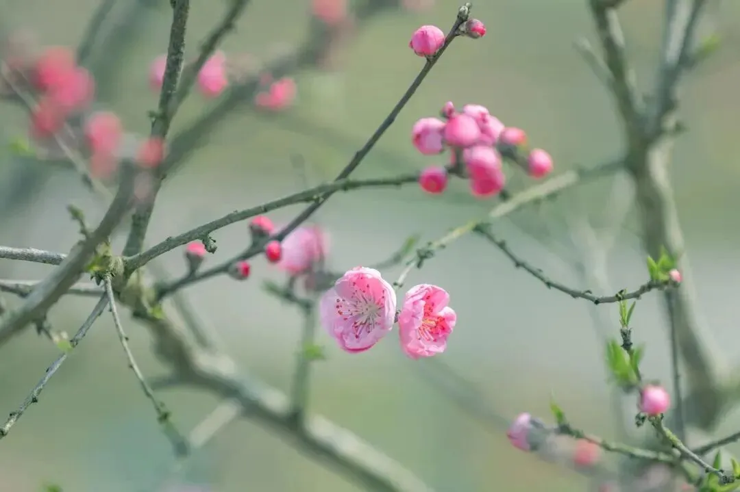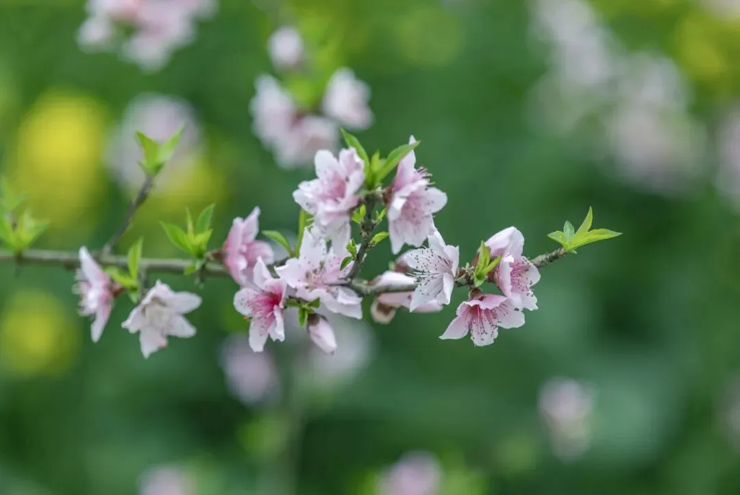 春意俏枝头,桃花竞相开,深深浅浅,绵延成片,落英缤纷的桃花林中藏着古人描绘的世外仙境,一簇新绿和盛开的桃花也带来春的气息。