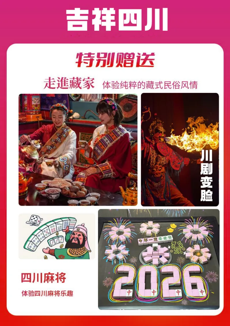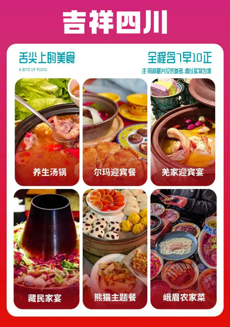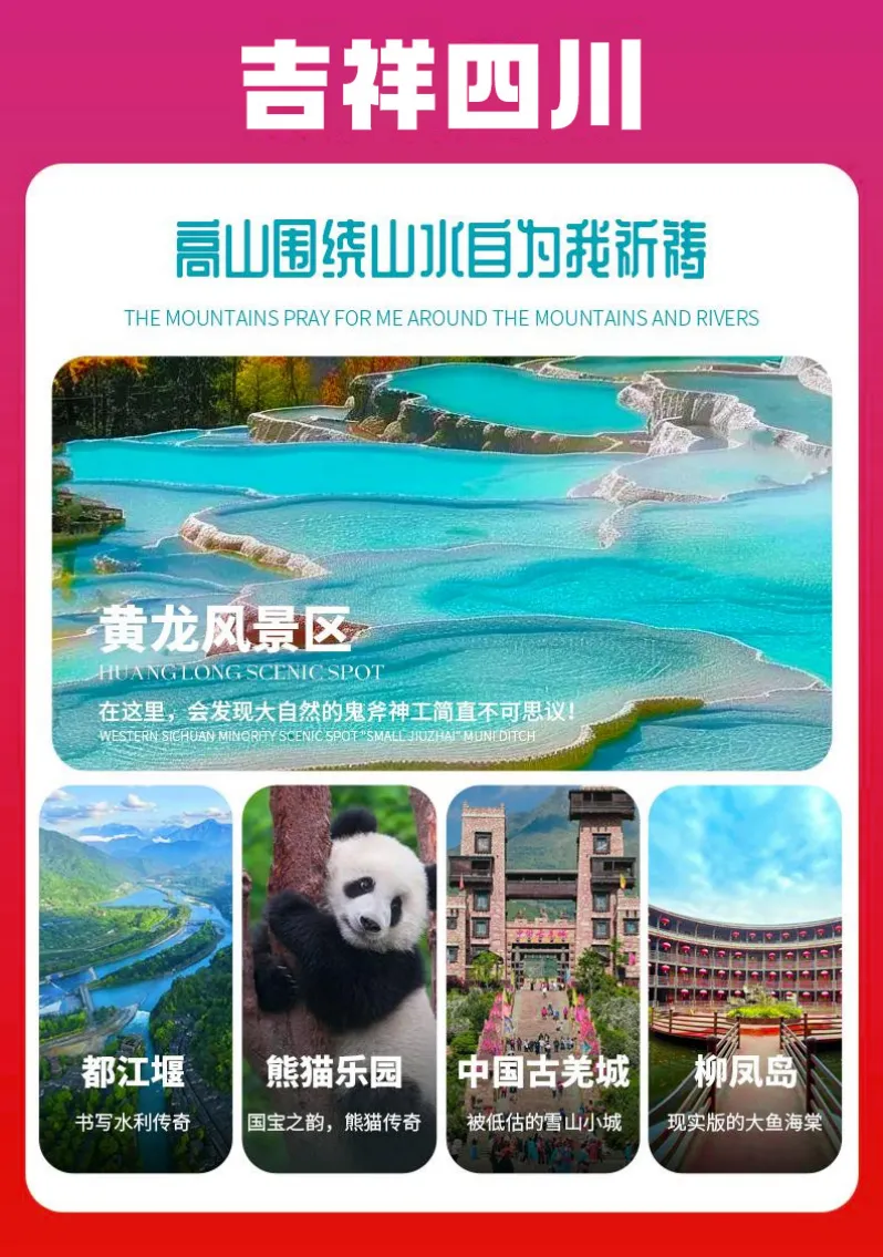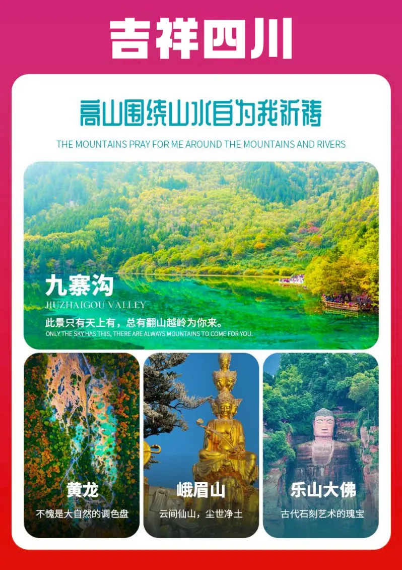 景点:九寨沟、黄龙、峨眉山、乐山大佛,三星堆、都江堰、熊猫乐园、古羌城、走进臧家、川剧变脸