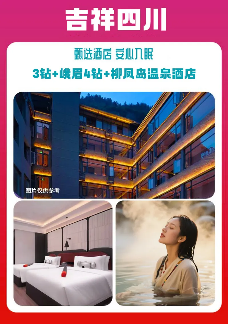 峨眉四钻参考酒店:世纪阳光酒店、柏曼酒店、漫雅酒店(具体酒店以实际安排为准,不接受指定)。