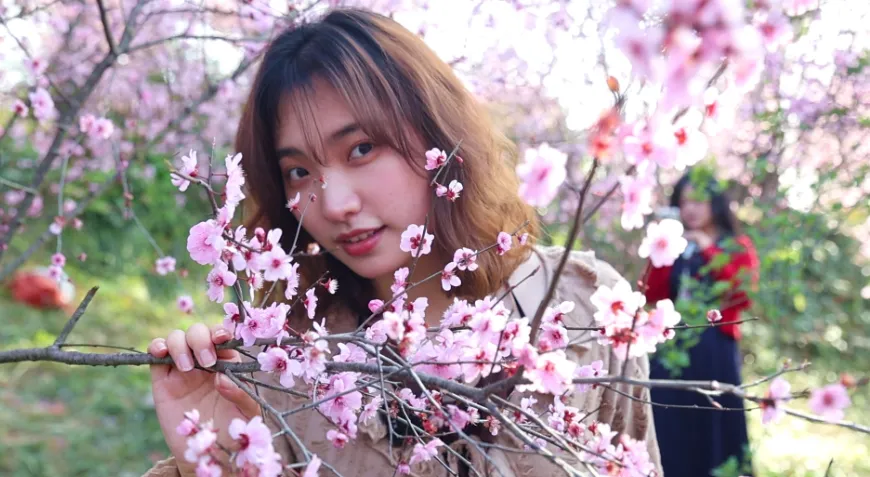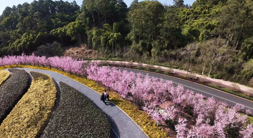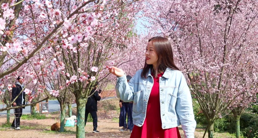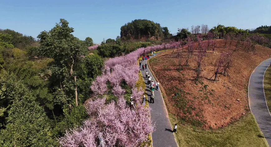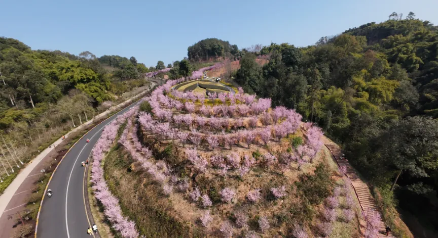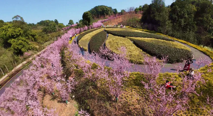 近日,乐山中心城区嘉州绿心公园内春意涌动,一碗水服务区附近的“海棠盛景”景观带中,6000余株美人梅次第绽放,粉海如云,吸引了许多市民游客前来踏青赏花。