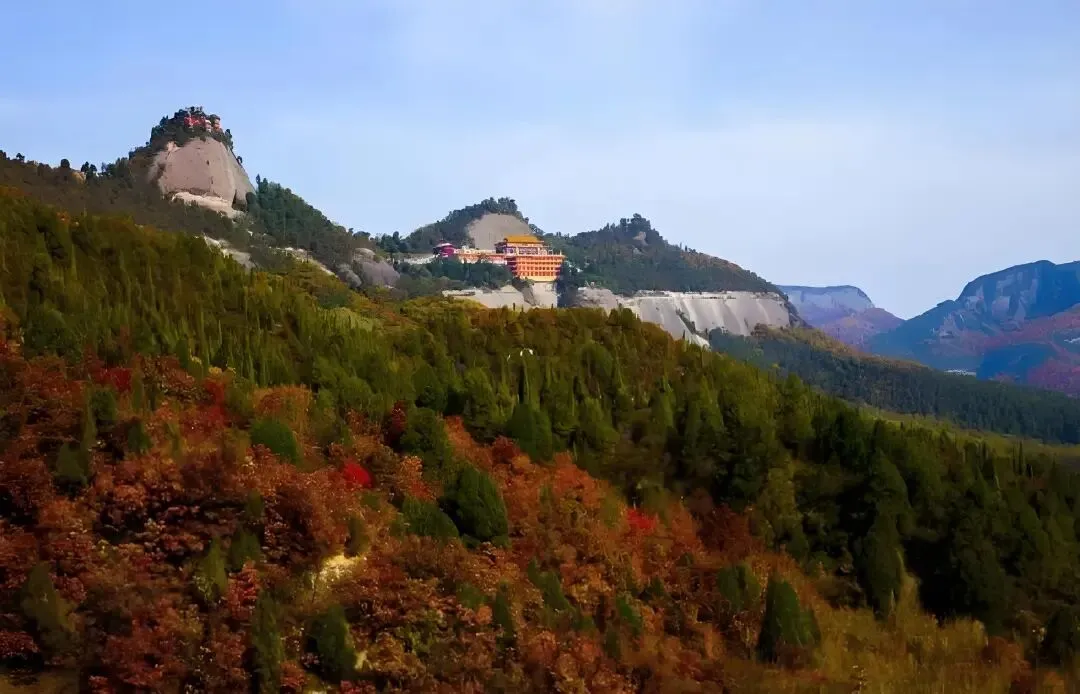 千亩槲树染赤崖,大香山寺悬于丹霞绝壁。十月登顶,看红浪翻涌与赭色岩层交叠。