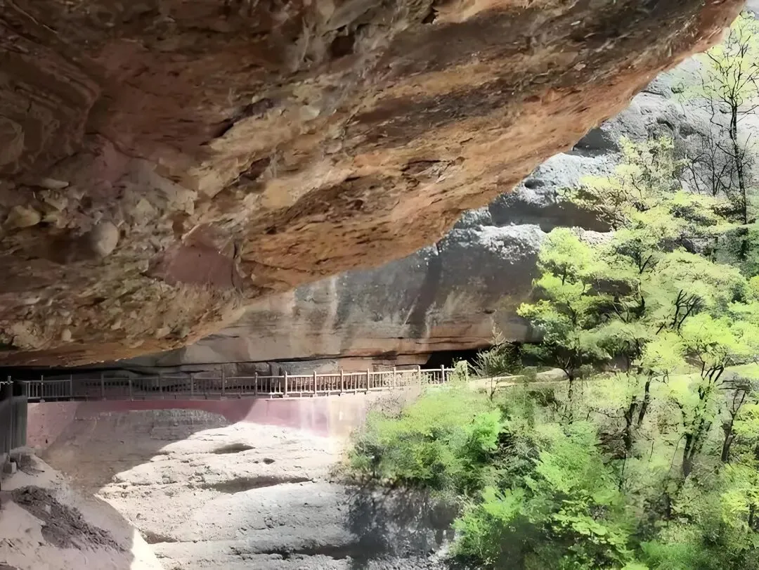 丹霞绝壁上凿出的红军密营!仅容一身的栈道攀向四座岩洞军寨,寨中药坊、枪械所犹存。立崖顶远眺,赤色峰丛如烈火奔涌。