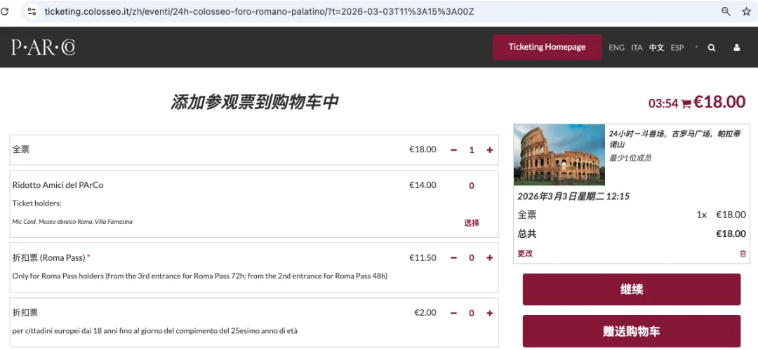 门票种类:地宫(€24很难抢)、顶楼(€24很难抢)、普通(€18好买,包括斗兽场、古罗马广场和帕拉蒂诺山)、竞技台(€24),我们前期测试了多次买顶楼票,都是秒没,所以果断放弃,锁定在经典的普通票上。