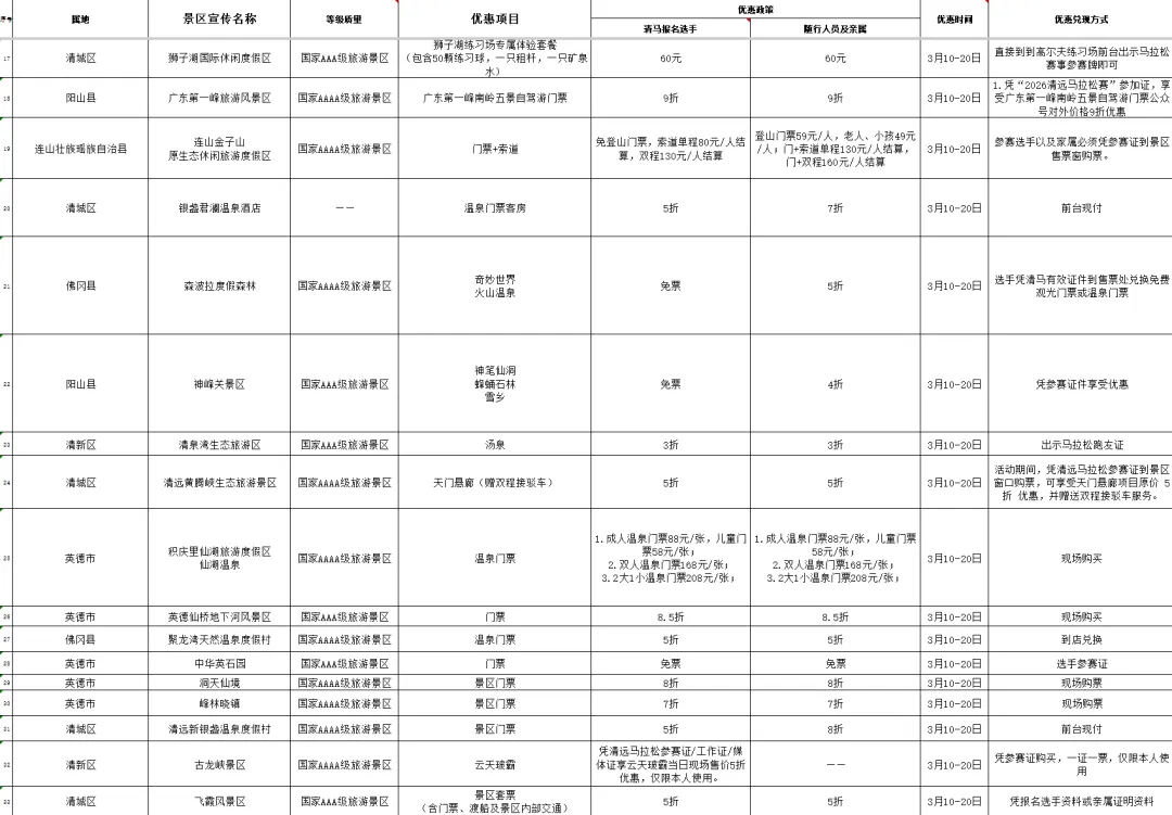 优惠力度:2026年3月10日至3月20日期间,参赛选手凭有效证件及抽签结果短信/APP报名页面享免费观光门票或温泉门票,随行人员凭有效证件亦可享观光门票或温泉门票5折优惠。