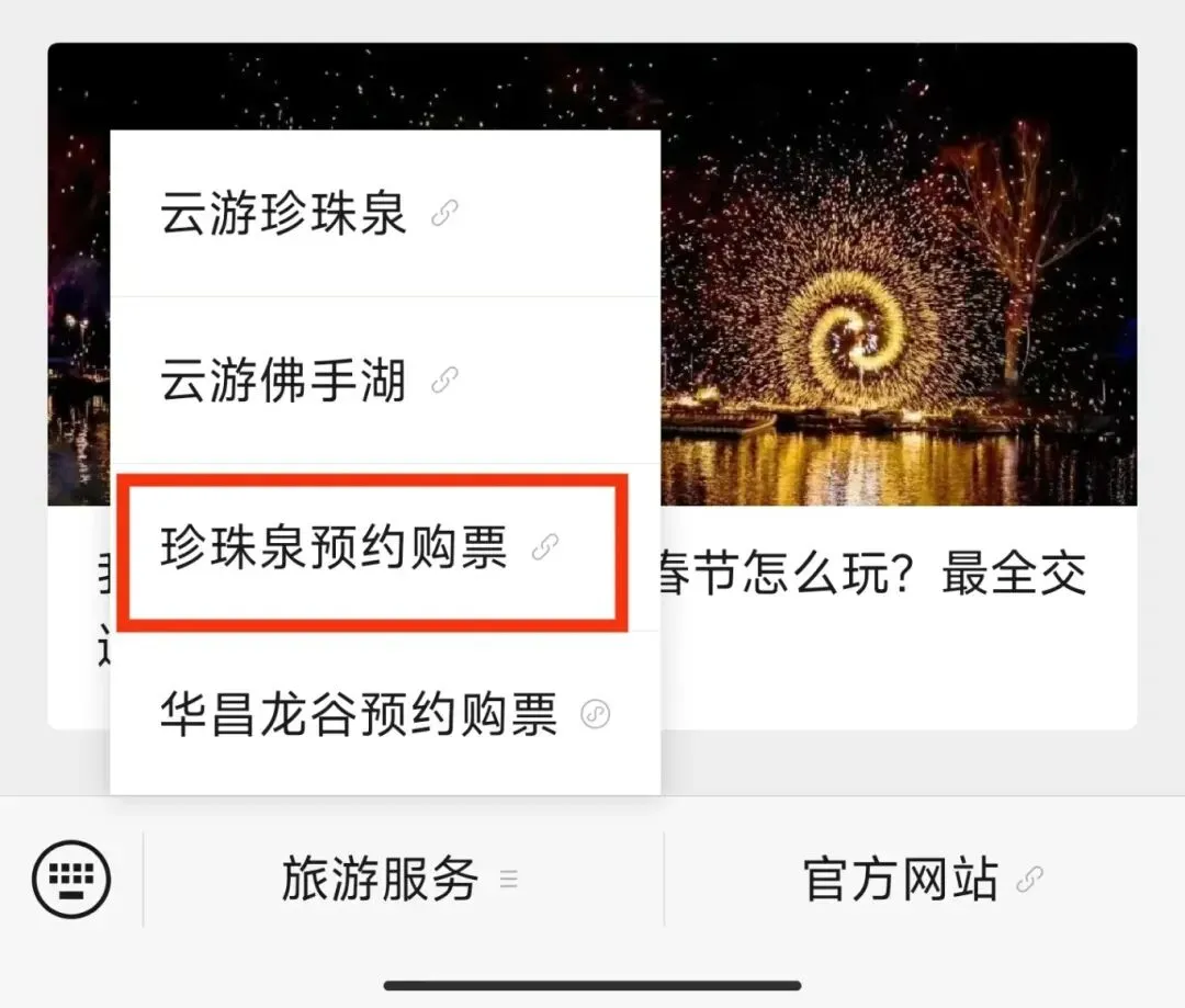 第一步,关注微信公众号“南京珍珠泉度假区”,点击菜单栏【旅游服务】中【珍珠泉预约购票】