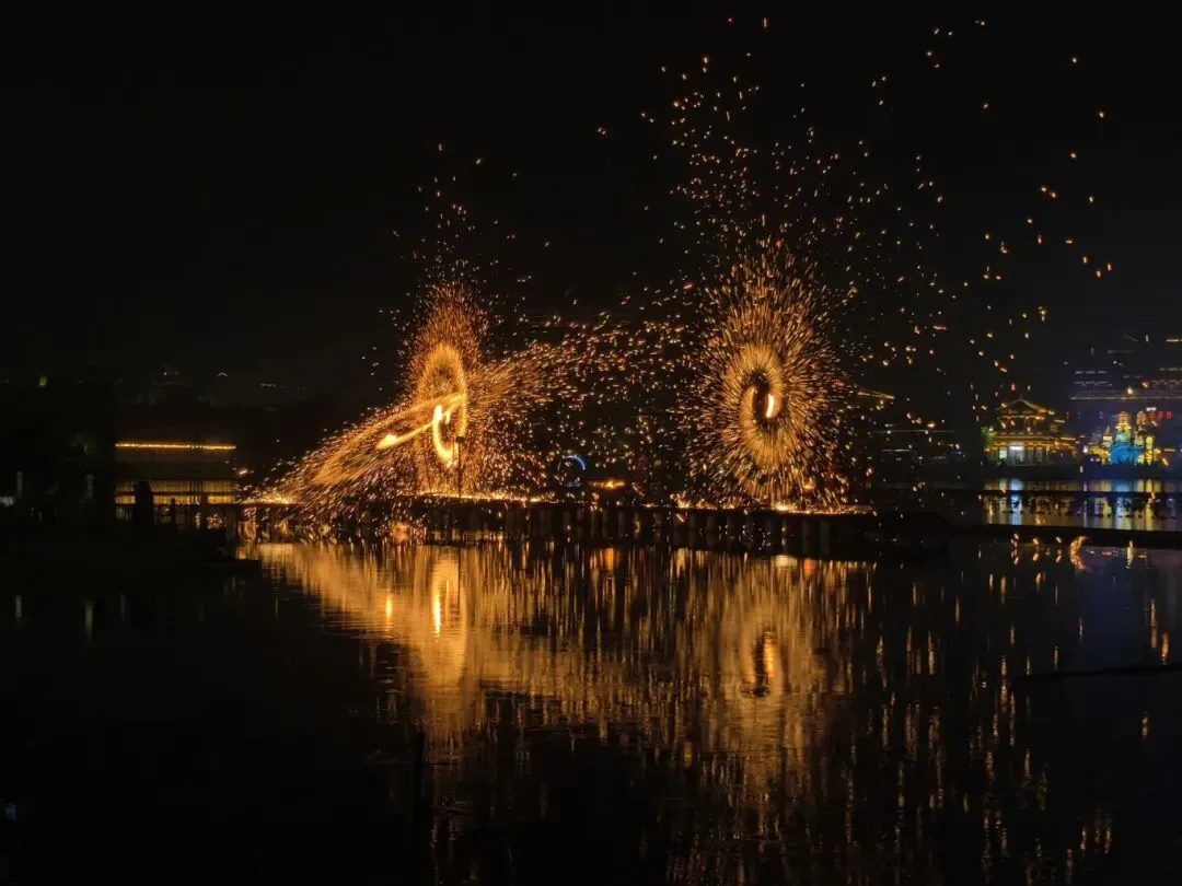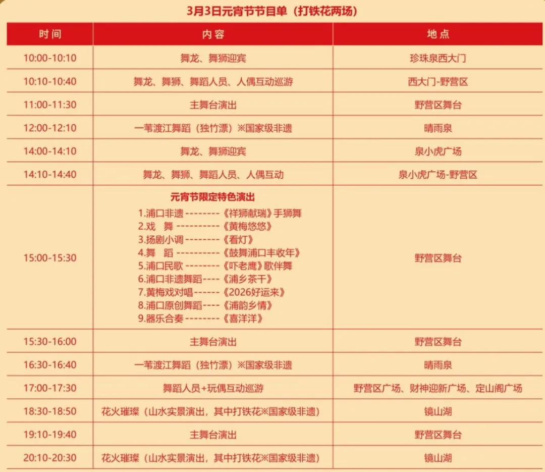 元宵节期间特地推出两场打铁花演出,时间分别为18:30-18:50、20:10-20:30,都在镜山湖表演。除外,还有更多演出内容。