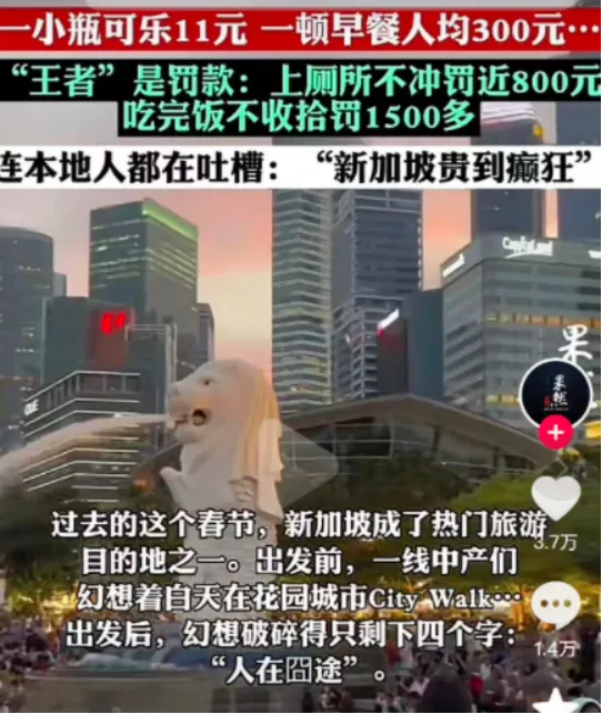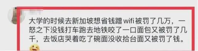 一瓶最普通的便利店矿泉水,9.7人民币,肥宅快乐水高达17.2一瓶,很难再快乐了。吃点东西填填肚子吧,随便进一个西餐厅,点了寻常的菜,两个人怒花900多人民币。来点大众实惠的吧,杨某福麻辣烫出了国之后,身价飙涨,一碗200多人民币。新加坡游玩一天,钱包里好像进了小偷,啥也没干,钱就刷刷出去了。这就更别提市中心那些全部4位数的酒店,动辄大几百上千的正餐。当然,去新加坡之前,大部分人对当地的物价都早有心理准备。新加坡最“贵”的,不是物价,而是它“又爱又恨”的罚款条例。但不好意思,喂一次新加坡的鸽子,你将付出2675元的代价!其实地铁禁止饮食在中国也是如此,只是在中国,抓到了无非是教育,在新加坡,你必须得老老实实交罚款。心里的委屈没地儿说,于是你拿起手机想跟国内的亲朋好友吐槽。却不知道连上了谁的Wi-Fi,你正感叹手机装的Wi-Fi万能钥匙靠谱,哪里都能连上网。要么老老实实交5万多人民币罚款,要么收拾收拾衣服,喜提3年监禁。还有网友说,大学的时候去新加坡,刚蹭Wi-Fi被罚了几万,又在地铁吃东西被罚了几千,哭着吃完饭没收拾餐具,又被罚了钱。是的,你没有看错,吃完饭不收餐具和台面,也是要被罚款的!一些在国内“没素质”惯了的人,去到了新加坡,不就是叠buff,一下子底裤都被罚没了?不仅吃完饭不收餐具要罚款,上厕所不冲水,也会痛失800人民币,冲不干净也要罚!“xx到此一游”刻在墙上,站在草丛花丛里挥舞丝巾,也是很多国人的传统艺能了。但你在新加坡这样做,严重的话,最高罚金高达2000新币,或面临有期徒刑3年。你要是违反,罚你50新币没商量。情节严重的话,还有高达1000元新币的罚款,或者3个月有期徒刑。每一个不遵守规则的人,都会在新加坡享受到铁拳的爱抚。于是,这些“一夜返贫”的中产,摸着被罚得干瘪的钱包,仰天长叹:然而,意想不到的是,新加坡的罚款举措,却得到了国内大部分人的一致赞同。不随意穿马路,不乱喂动物,不随地吐痰、随手冲厕,不乱写乱画,不影响他人,不都是最基本的素质吗?换句话说,你有素质,有公德心,在国内也遵守这些规矩,不管去哪里,都没有罚款的烦恼。工作人员飞速赶到现场,连声问了好几次老人:烟头扔哪了?高铁速度那么快,一旦烟头燃起来,不到一分钟,一个车厢都烧完了,人都来不及撤退。西安大唐不夜城爆火,随之而来的是垃圾遍地,保洁一天运十几车垃圾,都赶不上游客制造垃圾的速度。浙江某公园的网红花海,被游客肆意踩踏,甚至一把把摘下拍照。男子爬上长城,被拍到在墙上刻字,而很多地方,密密麻麻都是游客留下的痕迹。如果发现一个,狠狠罚他一回,或者拘留,给他履历留个污点,这样的行为,还会这么猖獗吗?人是最懂得趋利避害的,当发现那样做根本不划算,就会停止愚蠢的行为。说来说去,还是我们国内对这些巨婴太纵容,太手下留情。惩罚不够严厉,手段不够强硬,才导致类似情况屡屡发生。江苏一位老太在医院输液时,因为拔针时感到有点疼,就与医院工作人员发生了口角,打了保安一耳光。被打一个耳光,保安原本还想跟她理论,可是换来的却是大妈更用力的第二个耳光。保安一怒之下反抗,这一下大妈更嚣张了,开始打砸输液室内的各种设施。一女子质疑护士操作失误,就对护士掌掴,随后双手并用,向护士的头部、身上招呼。在护士解释,并多次提醒她按规定戴好口罩后,她愤怒地爆了句粗口。于是,求仁得仁,她被判入狱5周5天,罚款600新币,遣返回国。看到如此严重的责罚,她马上认罪受罚,并缴纳1.5万元保释。这个网红,就是在国内嚣张惯了,才会在新加坡如此横行霸道,可是新加坡法律不惯着她。她执意要带水果刀进地铁站,民警劝阻警告她时,她像是突然发疯一样一脚踢向了民警裆部,随后在走廊里又扇了民警耳光。在因为袭警和妨害公务被带去审讯之后,她牛逼哄哄地笑着说,最多拘留15天,脸上写满了嘲讽的笑容。这些打护士、打警察、打保安的人,其实他们一开始就知道自己做得不对,但他们就是想要胡搅蛮缠、野蛮暴力到底,因为不需要付出多少代价。所以面对这些没有素质、蛮横无理的渣滓,我们常常会陷入到一种深深的无奈当中。归根到底,就是制度的纵容和社会的忍让,才会让他们越来越得寸进尺,越来越猖狂。她因为一些琐事迁怒免税店的工作人员,动手打人,狠狠地掌掴了店员两次。后来,她被机场警方逮捕,被送到看守所,以攻击罪名关押。2018年4月,一位中国女子因为在美国一家咖啡店插队点单被服务员拒绝后,她气急败坏地抄起身边一位顾客手里滚烫的咖啡,泼在了店员脸上,并迅速逃之夭夭。结果没几天,她就被警方通缉抓获,在以“持械伤人”被起诉后,将面临最高10年的监禁。