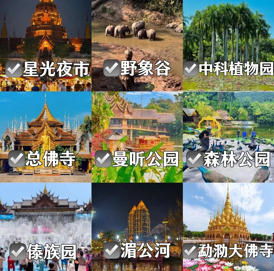 热带风情🌿:望天树景区探原始雨林,中科院热带植物园看王莲、奇花,野象谷寻野象踪迹 傣族文化🎋:4月体验泼水节,逛曼听公园(傣王御花园)、总佛寺,住傣家竹楼,吃菠萝饭、香茅草烤鱼 异国风情🌃:告庄西双景星光夜市(亚洲最大之一),尝东南亚美食,乘澜沧江游船(湄公河上游)