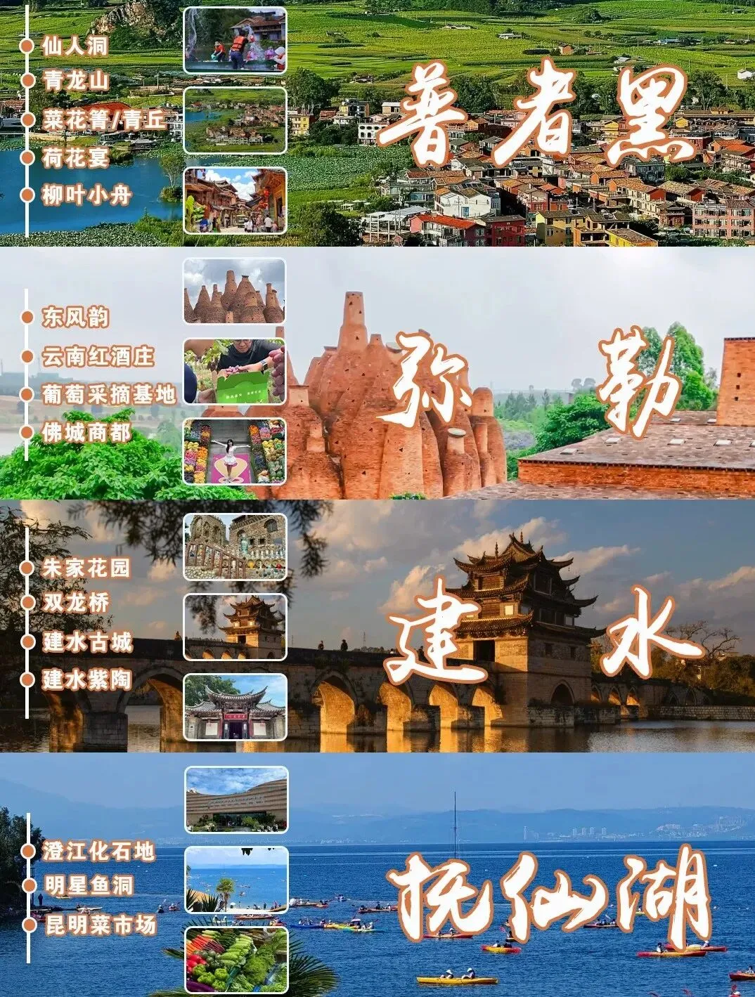 元阳梯田🌾:看哈尼族杰作(多依树日出、坝达日落最佳),逛哈尼村寨 建水古城🍲:漫步古城,访文庙、朱家花园,乘建水小火车,吃西门烧豆腐、汽锅鸡、草芽米线 普者黑🌸:《三生三世》取景地,乘柳叶小舟游喀斯特田园(夏季荷花最美),感受撒尼族文化