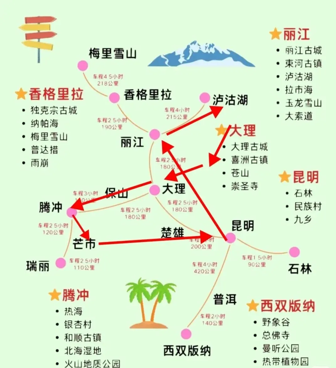 方案1(西北线+东线):大理(2天)+ 丽江(2-3天,含泸沽湖/束河)+ 香格里拉(2-3天)+ 普者黑/建水/元阳(4天选2),适合摄影、民族风情爱好者 方案2(西北线+滇西):腾冲(2-3天)+ 和顺+瑞丽(1-2天)+ 大理(1天)+ 丽江(2天),适合人文、边陲、温泉爱好者 方案3(西北线+南线):丽江/大理(3-4天)+ 西双版纳(4-5天),感受雪山与雨林的碰撞(需长距离交通)