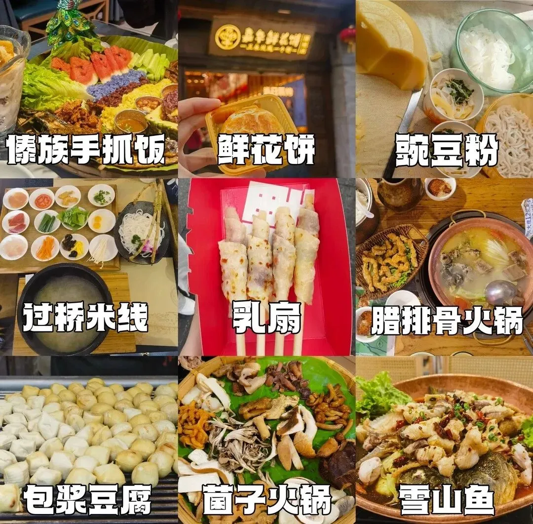 大理:酸辣鱼、永平黄焖鸡、白族生皮(谨慎尝试) 丽江:腊排骨火锅、黑山羊火锅、鸡豆凉粉、纳西烤鱼 西双版纳:香茅草烤鱼/鸡、菠萝饭、包烧、凉拌鬼鸡、傣味烧烤 建水:烧豆腐、汽锅鸡、草芽米线 香格里拉:牦牛肉火锅、藏式烤肠、酥油茶、青稞饼、尼西土鸡火锅