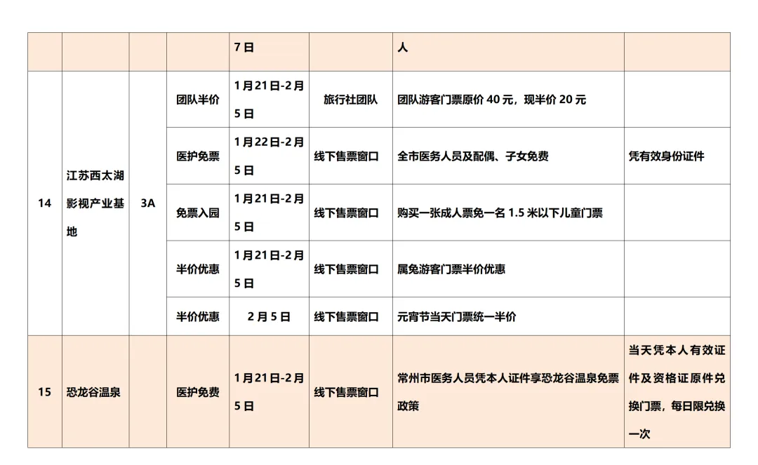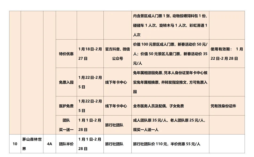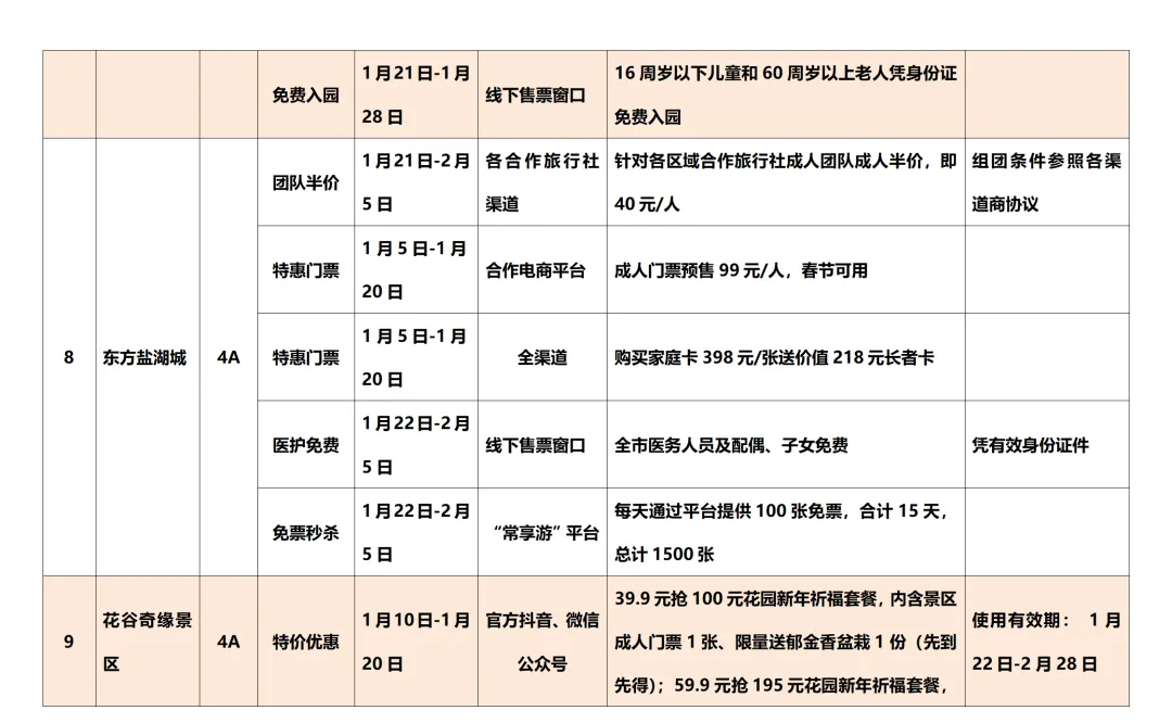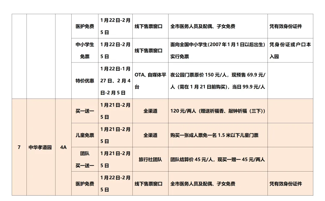 春节期间(1月22日-2月5日),全市A级旅游景区对团队游客实行门票半价,对本市医务工作者实行免门票。