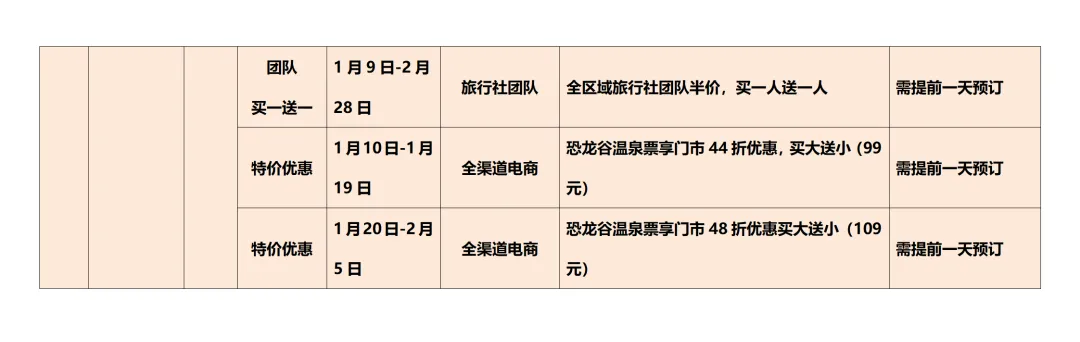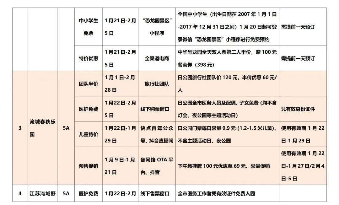中华恐龙园享两人同行第二人半价,亲子同游儿童免单;全国中小学生实行免票;全市医务人员及其配偶、子女可享免费入园,游客登录“恐龙园景区”微信小程序预约。