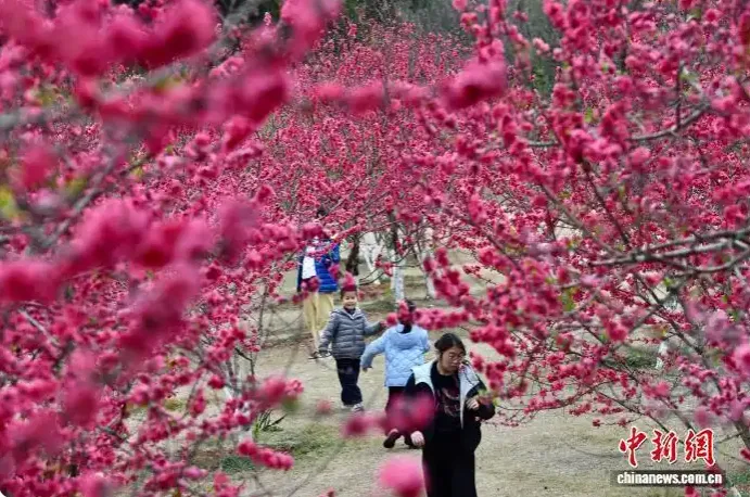 600余株桃树上的桃花竞相绽放,碧桃、照手红、寿白桃等多个品种,织就了一幅醉人的春日画卷。