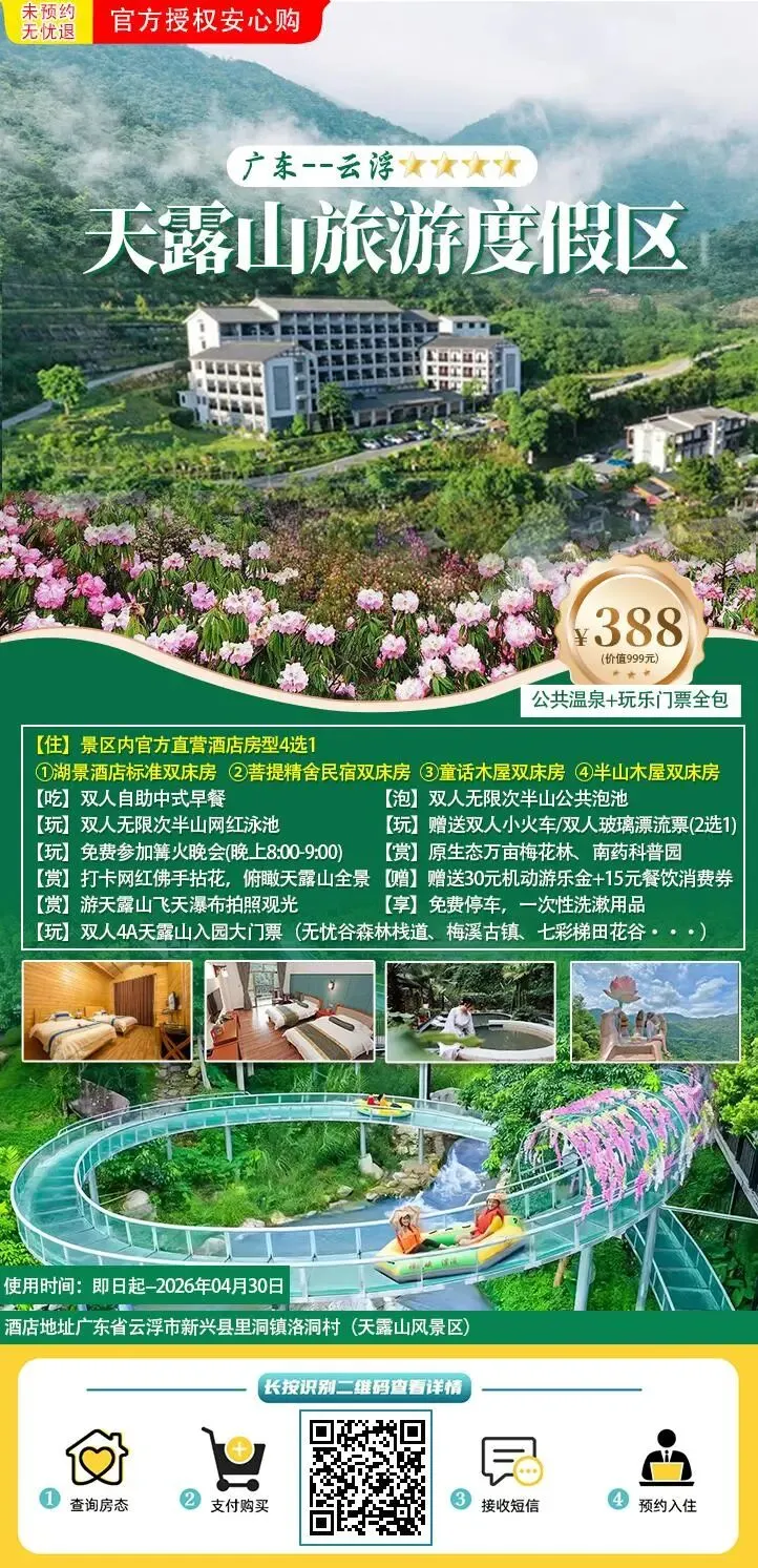 天露山景区:景区入园门票营业时间:9:00-17:00 (免门票政策:1.2米以下,65岁以上、军人免景区入园门票),套餐包含4A景区入园大门票(包含赏梅花、梅溪古镇、七彩梯田花谷、竞技拓展场、无忧谷森林栈道、南药园),免费观看篝火晚会(晚上8:00-9:00),赠送30元机动游乐金,可选玩机动游戏或VR全景游戏,赠送的双人小火车/双人玻璃漂流票(2选1),门票单次使用,请在酒店前台领取门票