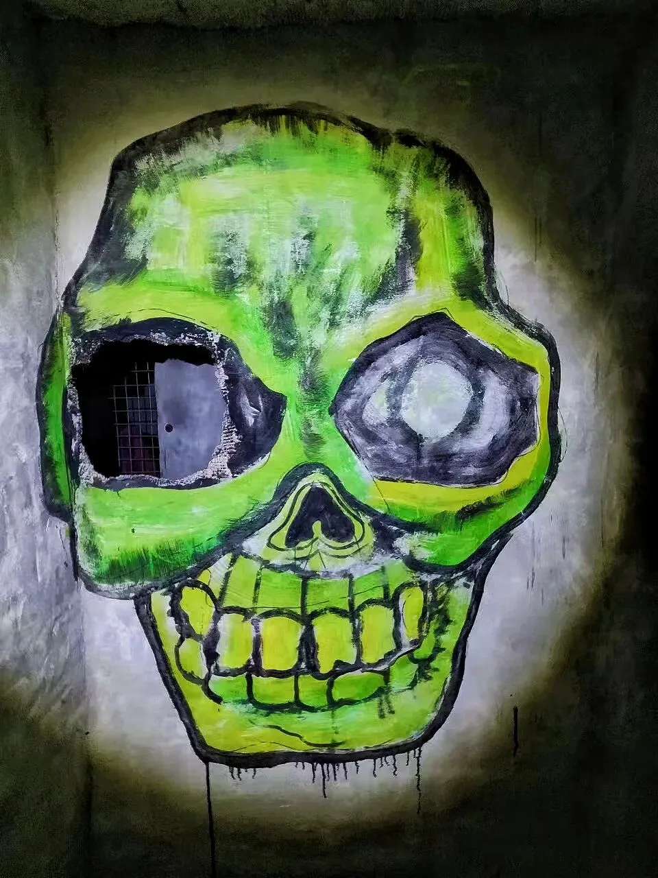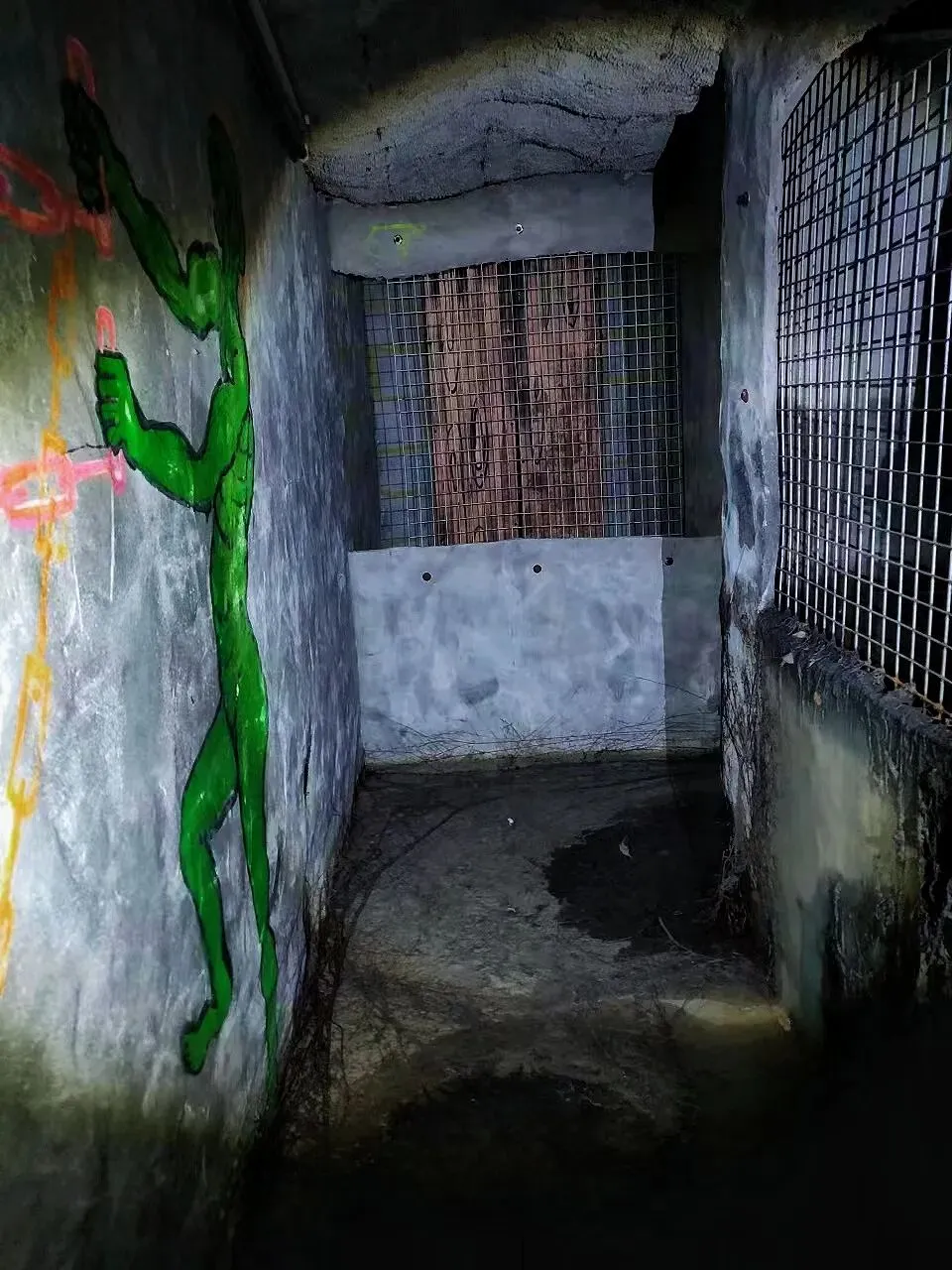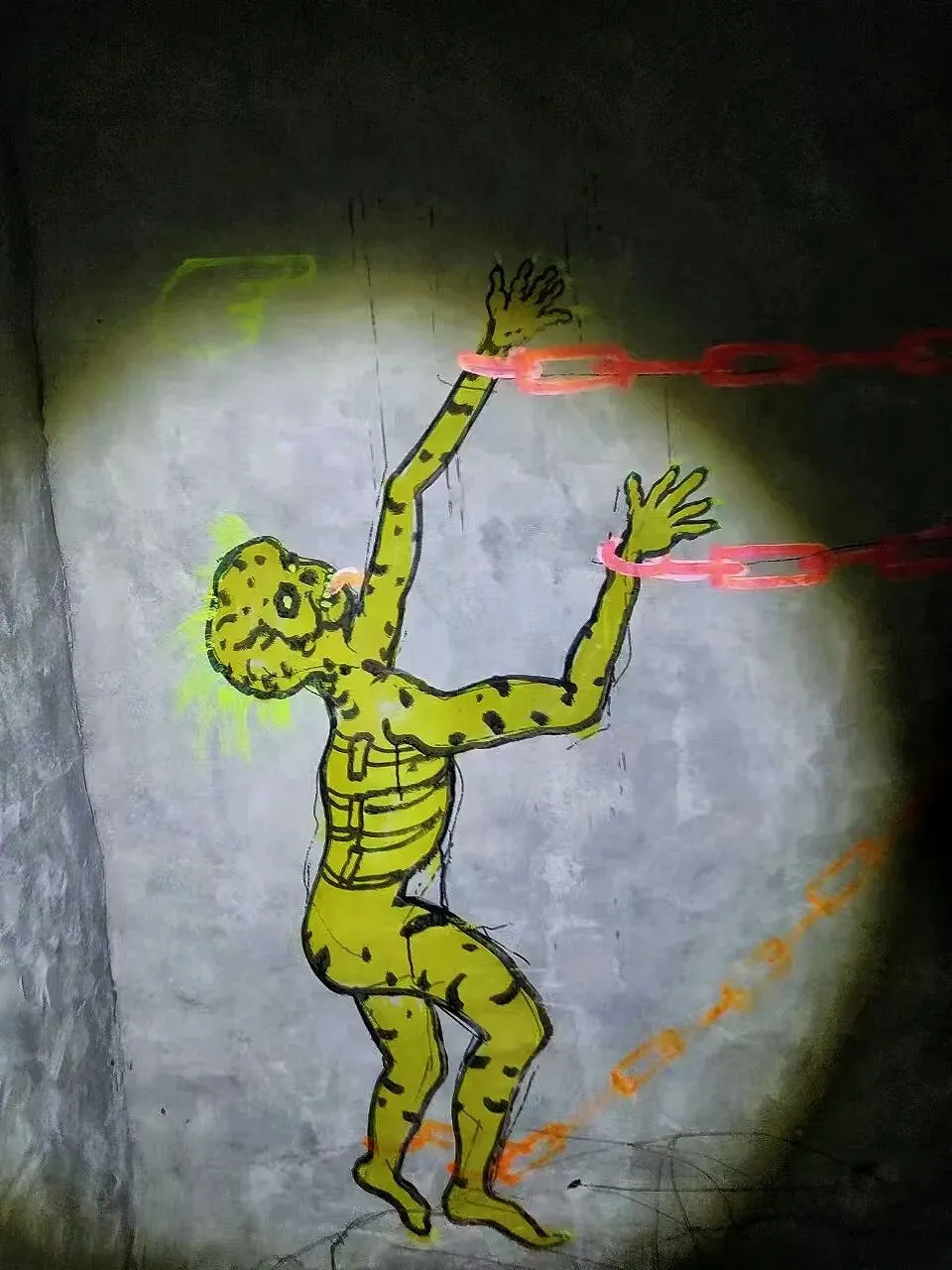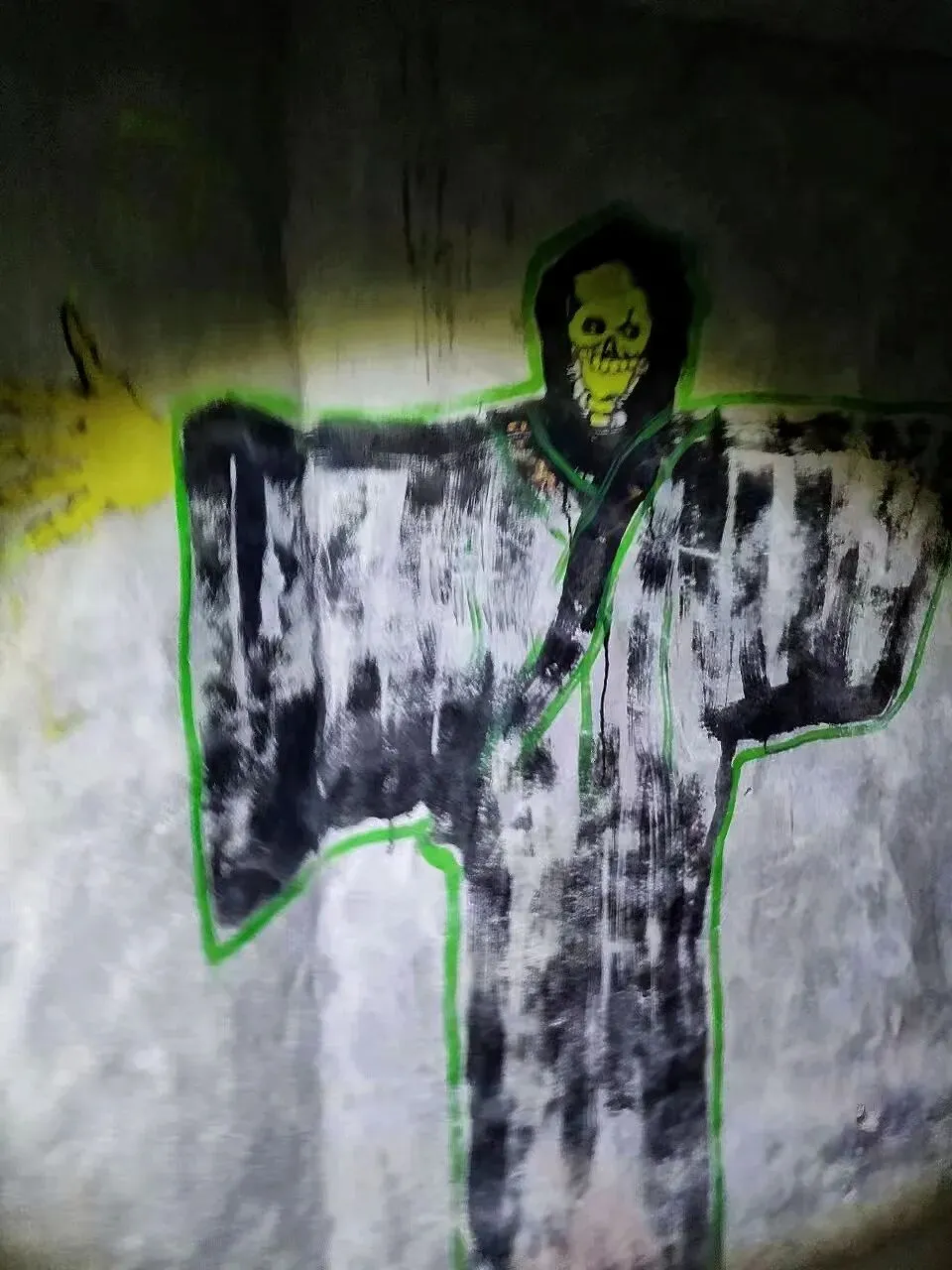 墙壁上画着一个绿鬼在氛暗环境地下还泡着水 (>_<)