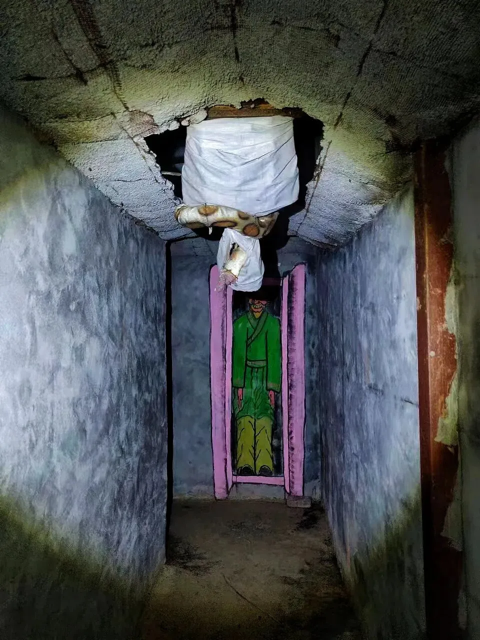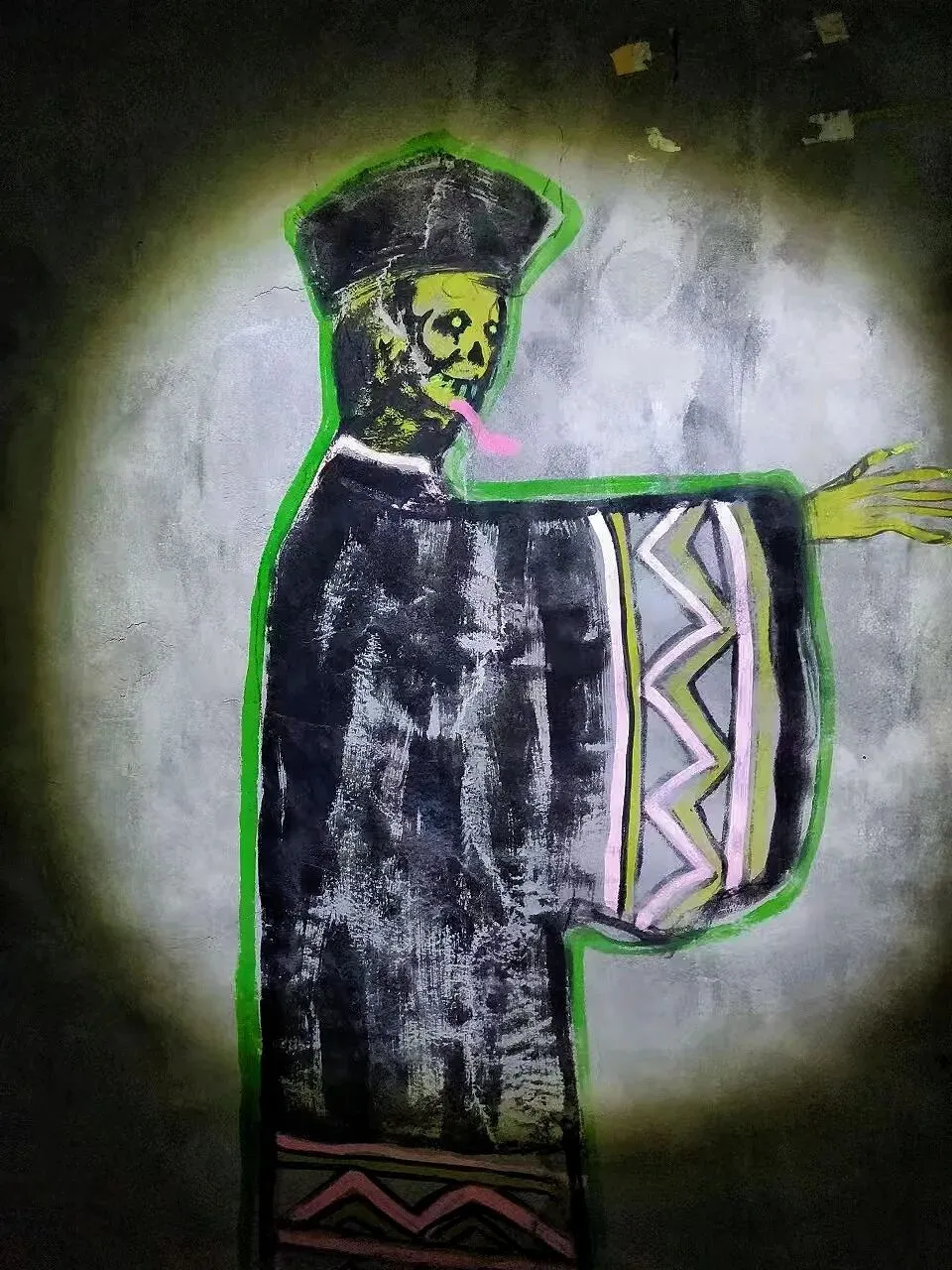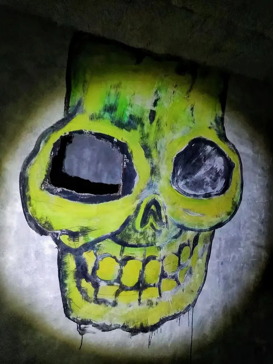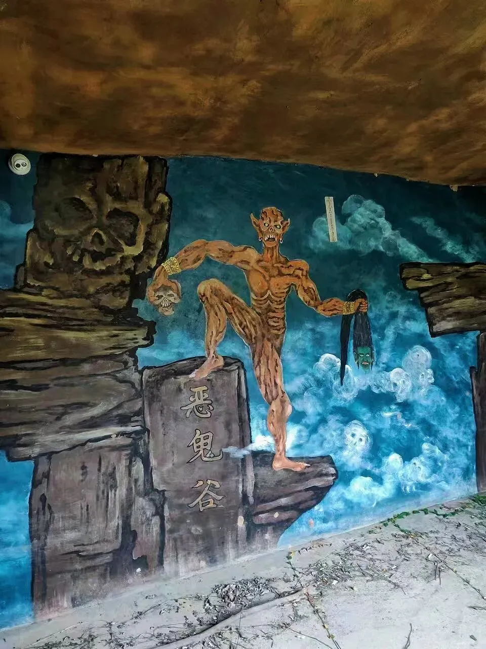 墙壁上画着一个绿鬼在氛暗环境地下还泡着水 (>_<)