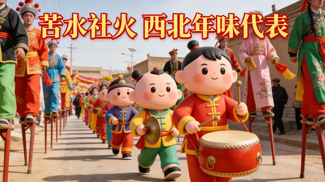 结论:苦水社火的精髓是“高高跷”和巨型的“福”字面具。西北豪迈,扑面而来。