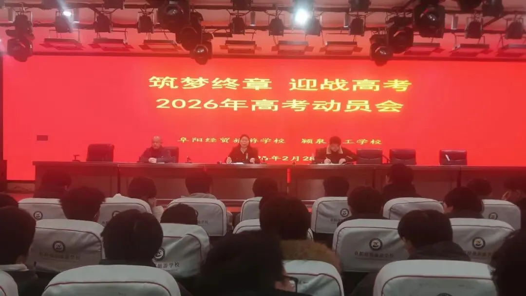 2月28日阜阳经贸旅游学校隆重举行“筑梦终章,迎战高考”2026届高考动员大会,全体高三师生参会。
