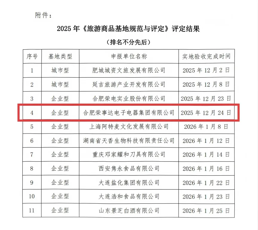 近日,中国旅游协会根据团体标准T/CTAT 0007-2025《旅游商品基地规范与评定》,对11家拟认定为旅游商品基地的单位进行公示,位于我县的合肥荣事达电子电器集团有限公司入选。