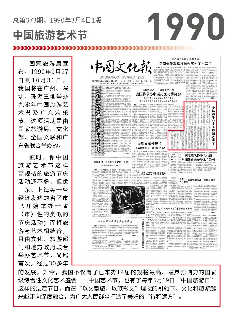 彼时,像中国旅游艺术节这样高规格的旅游节庆活动还不多,但像广东、上海等一些经济发达的省区市已开始举办全省(市)性的类似的节庆活动;而将旅游与艺术相结合,且由文化、旅游部门和地方政府联合举办艺术节,尚属首次。经过30多年的发展,如今,我国不仅有了已举办14届的规格最高、最具影响力的国家级综合性文化艺术盛会——中国艺术节,也有了每年5月19日“中国旅游日”这样的法定节日,而在“以文塑旅、以旅彰文”理念的引领下,文化和旅游越来越走向深度融合,为广大人民群众打造了美好的“诗和远方”。