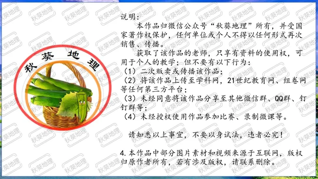 1.本作品归微信公众号“秋葵地理”所有,已登记版权,大部分已拿到纸质证书,作品受国家著作权保护,任何单位或个人不得以任何形式再次销售、传播。