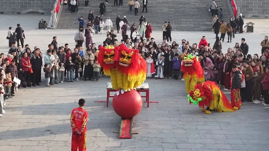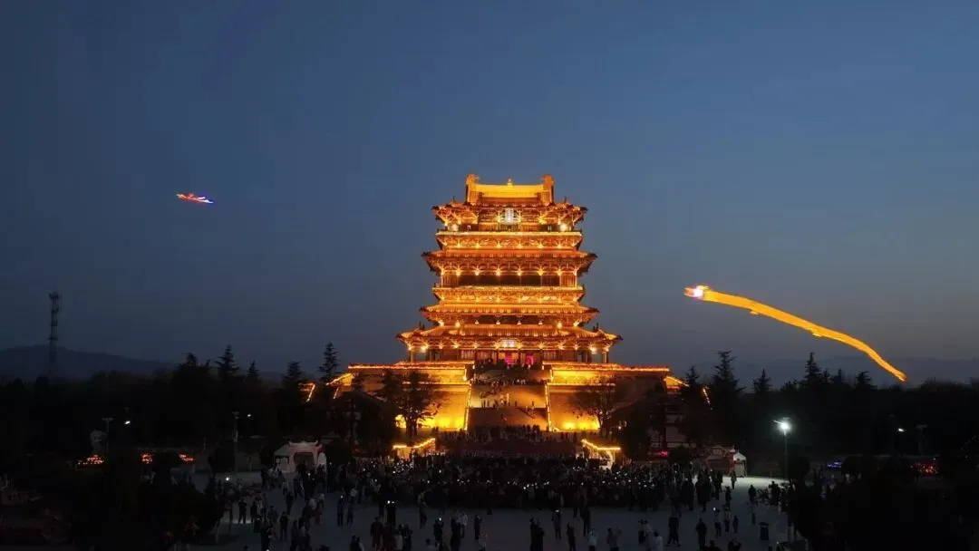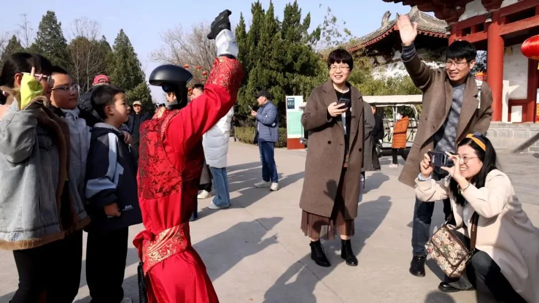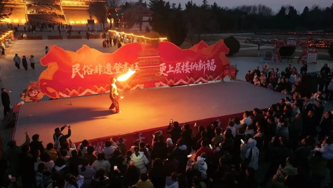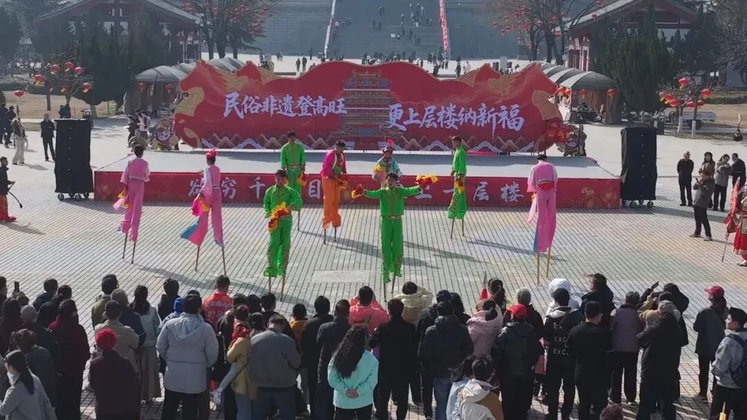 春节期间,鹳雀楼景区日间上演名楼迎宾、南狮送福、戍边巡园、货郎巡园等沉浸式巡游,高跷、杂技、中幡等民俗展演轮番登场,让游客近距离感受传统技艺魅力。