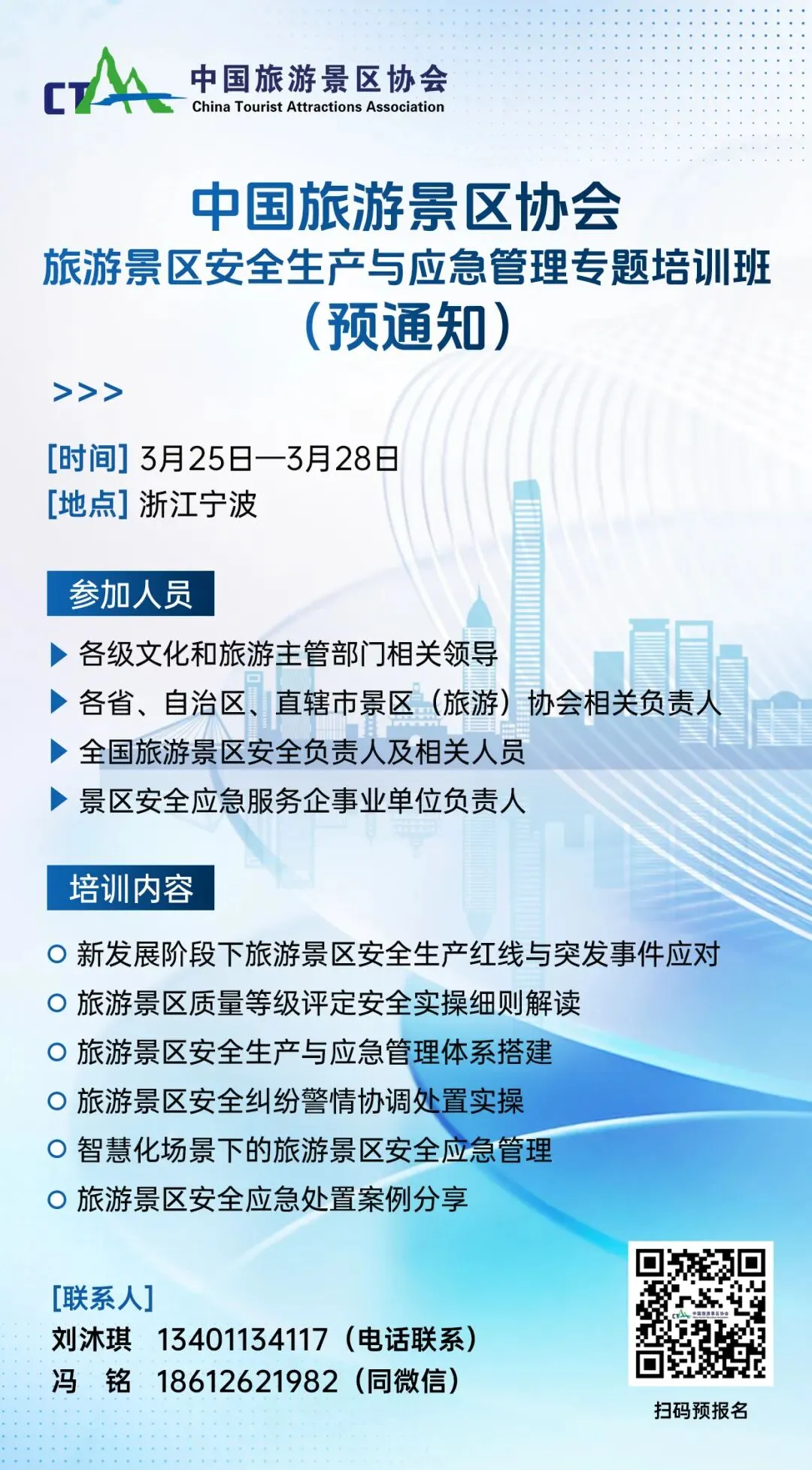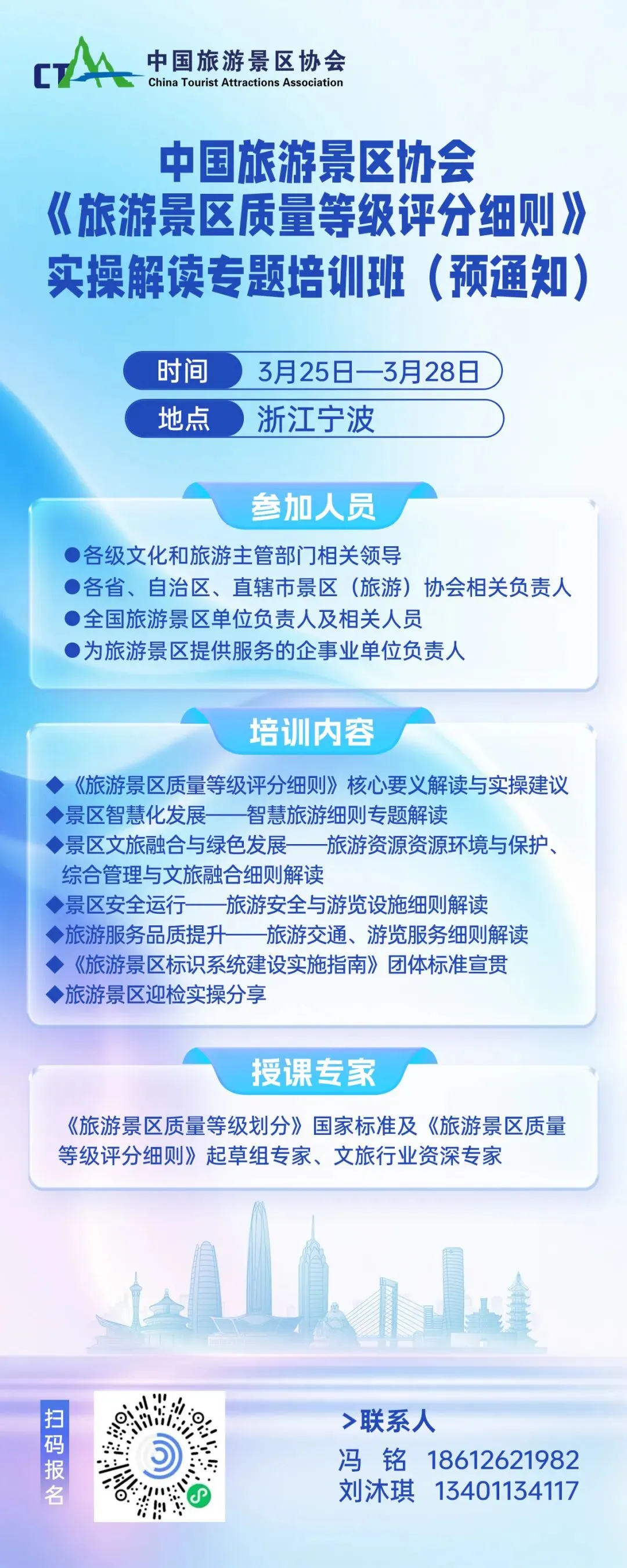 为深入贯彻落实文化和旅游部关于推动旅游景区高质量发展的工作部署,严格对标《旅游景区质量等级划分》国家标准及相关评分细则,进一步规范景区运营管理、提升服务品质,全面压实安全生产主体责任,强化风险防控与应急处置能力,切实保障景区安全有序运行和游客生命财产安全,助力旅游景区提质增效、转型升级。中国旅游景区协会拟举办《旅游景区质量等级评分细则》实操解读专题培训班、旅游景区安全生产与应急管理专题培训班,旨在通过系统培训、精准解读、实务指导,推动景区管理人员熟练掌握标准要求、提升专业素养、强化安全意识,促进全国旅游景区规范化、标准化、安全化发展。