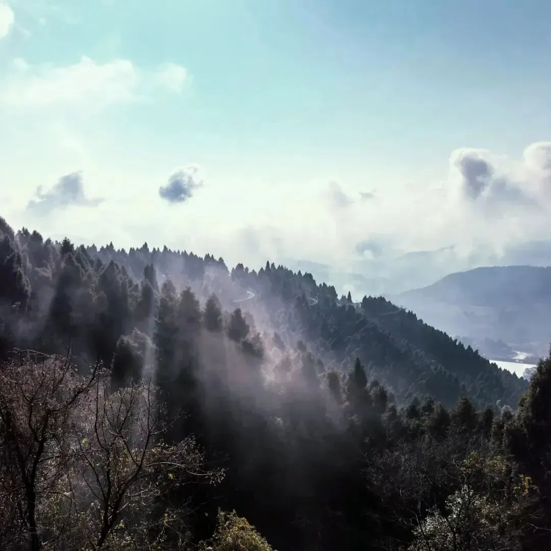 登顶远眺,城市的轮廓在薄雾中若隐若现。