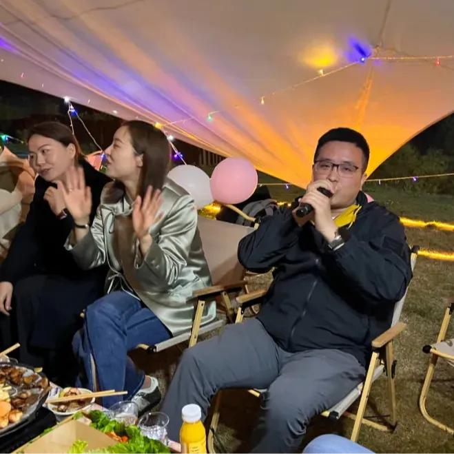 草坪上支起天幕,阳光透过新绿的枝叶洒下斑驳光影。