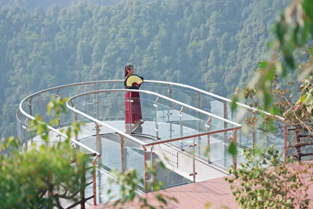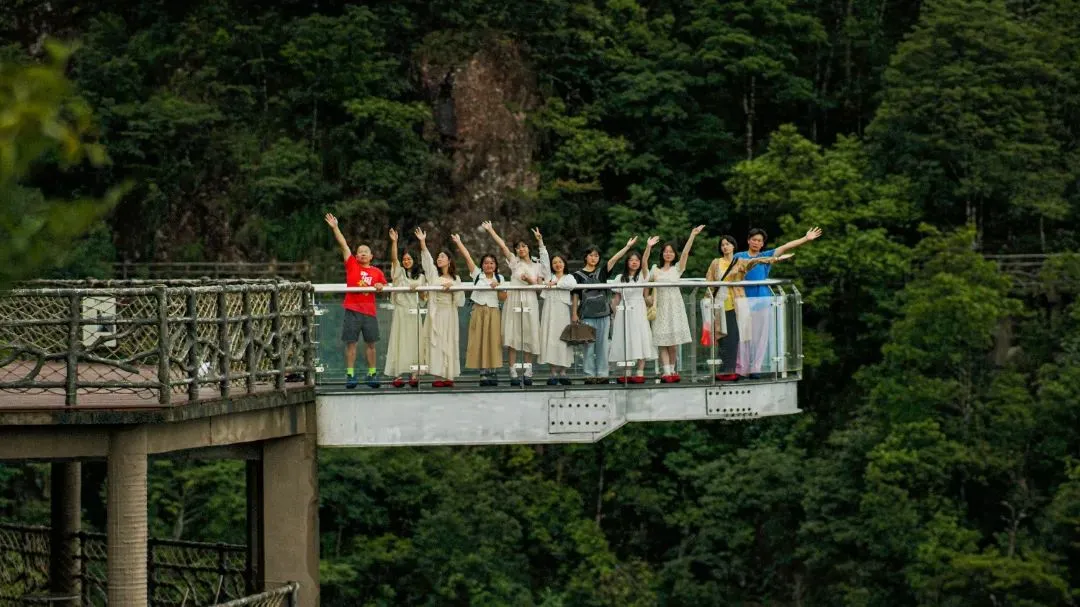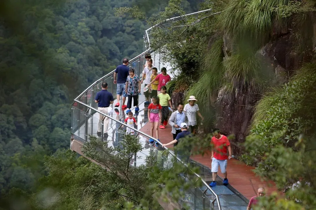 前往【玻璃天桥】体验全长330米,宽2.5米,最高落差198米,是目前江西最长的玻璃天桥。山间云雾缭绕,横跨两山的玻璃桥仿佛横架云端,恰似人间仙境。玻璃眺台应用杠杆原理,内接崖壁,外挑6.6米,采用国家专利技术的三层夹胶防爆玻璃,每平米可承重300公斤,桥面可同时容纳25人。