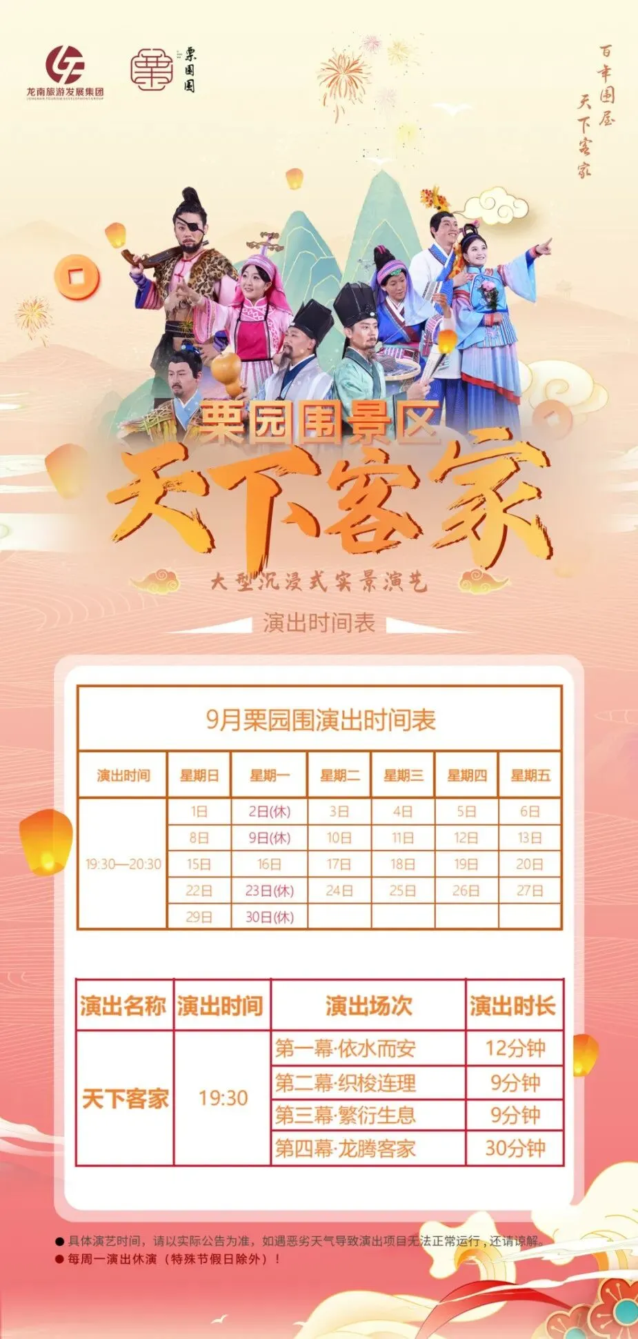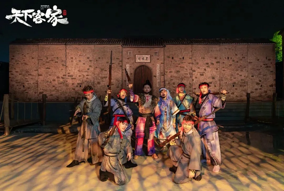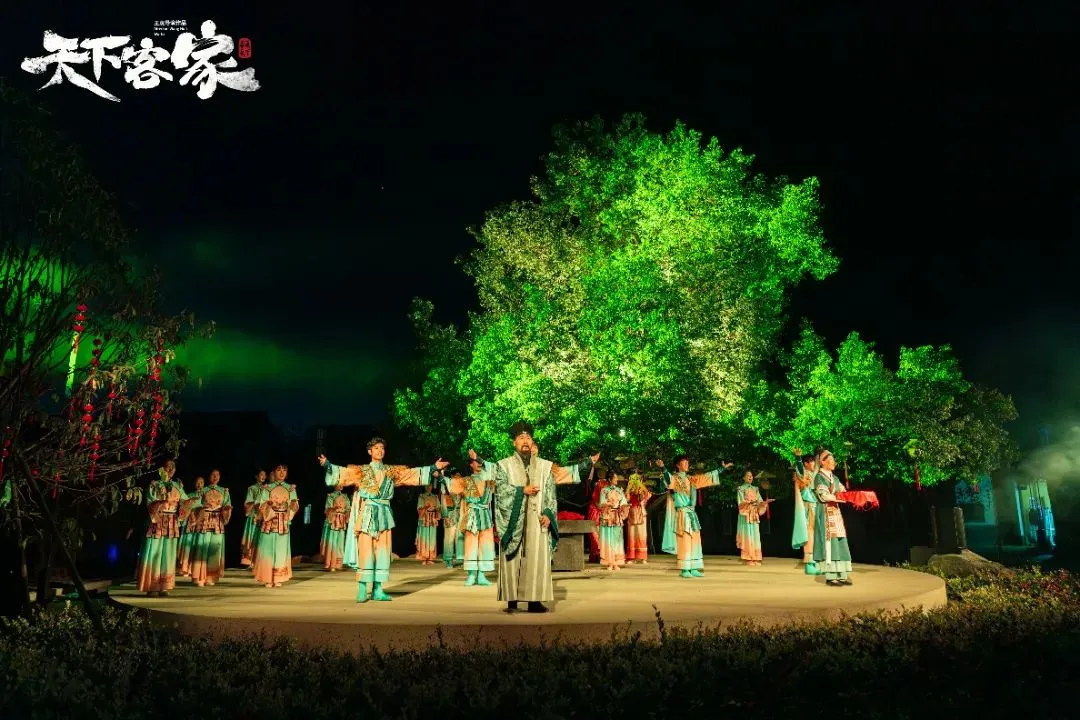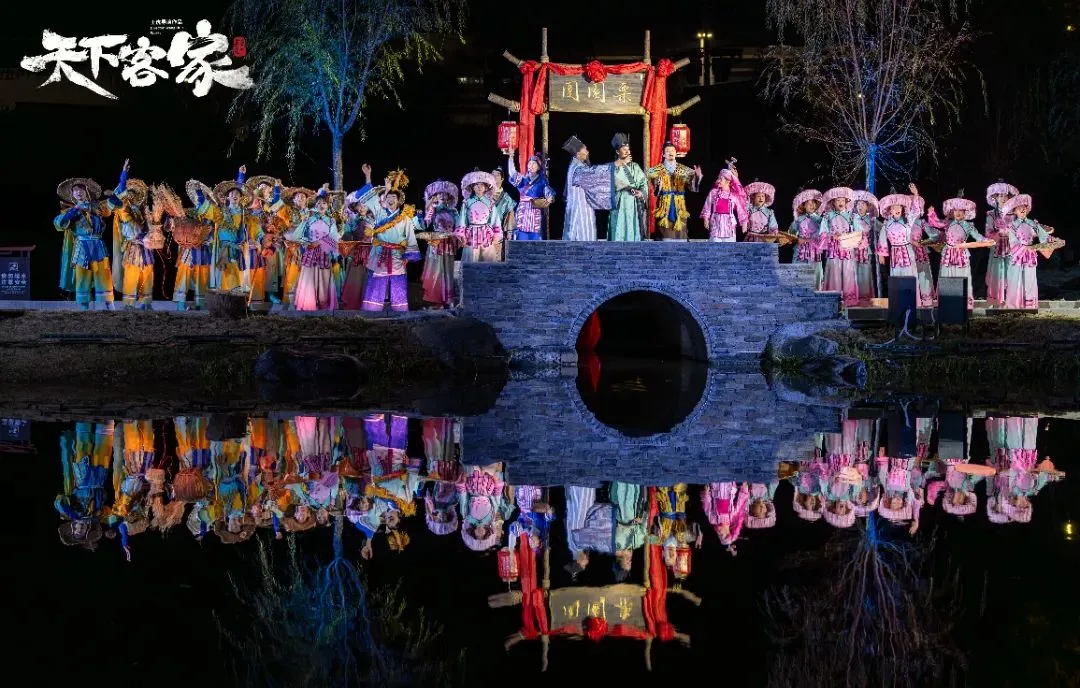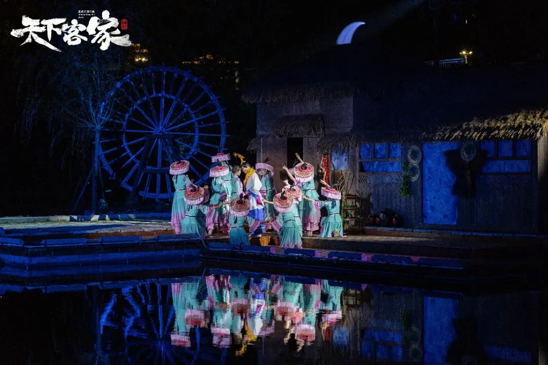 晚餐后观看栗园围的《天下客家》表演是根据栗园围现有的建筑空间环境进行创作的实景剧 表演形式:通过戏剧、舞蹈、音乐、灯光、装置等多种艺术形式相结合,生动地展现了客家人的生活场景、文化传统和精神风貌。这种多元化的表演形式能够给观众带来强烈的视觉和听觉冲击,让人们仿佛穿越时空,回到了过去的客家生活中。
