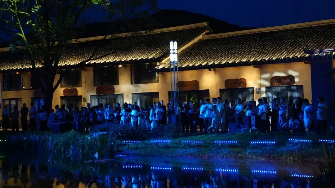栗园围景区湖中心灯光亮起