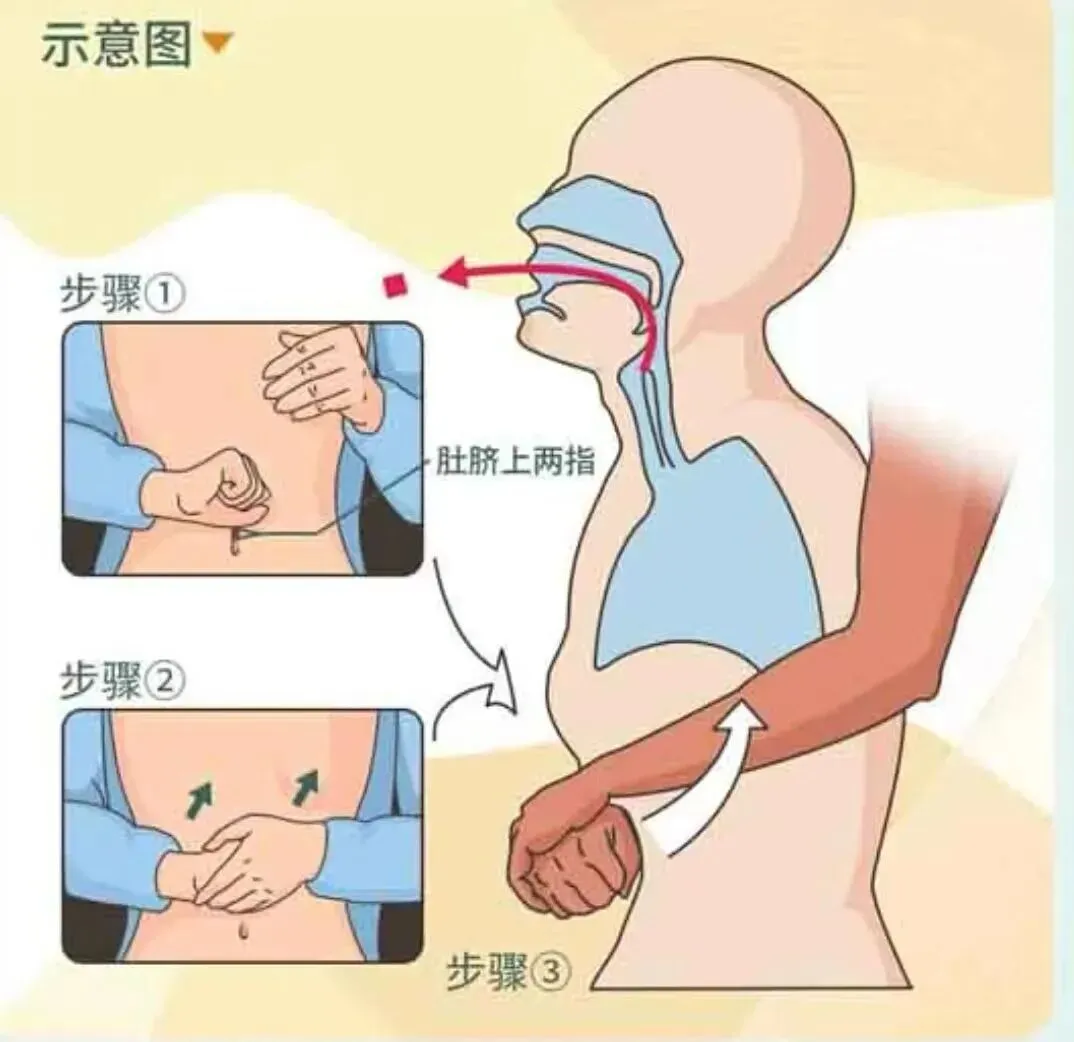 该方法针对不同人群有不同的操作方式,主要区分成人及儿童两种类型,对于成人,当其呼吸道有异物时,施救者应站在患者身后,手握拳,快速冲击患者腹部,连续冲击几次,借助肺部残余气体将异物咳出。
