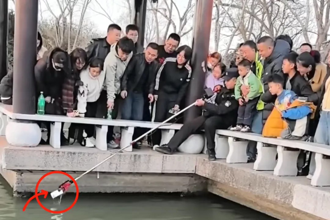 而是民警手中一根探入水下的