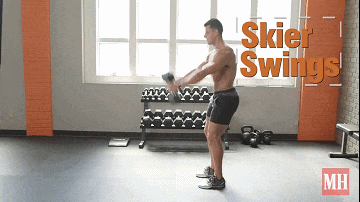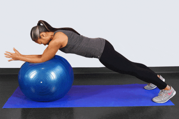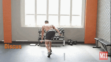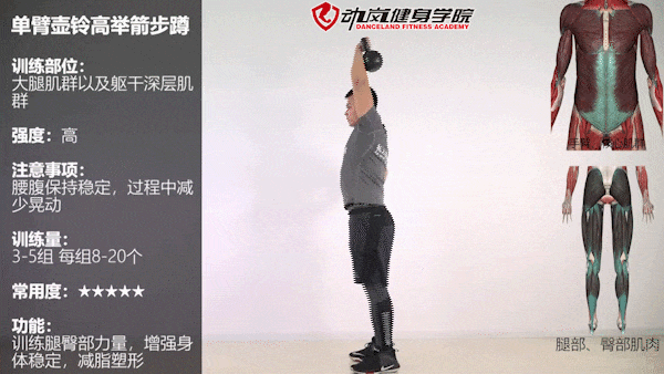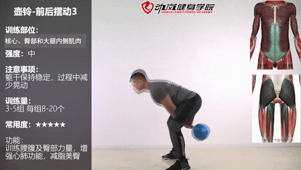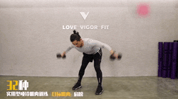 第二组动作:哑铃上下摆动 + 瑜伽球收腹 + 哑铃铁饼投掷 + 单臂举壶铃箭步蹲