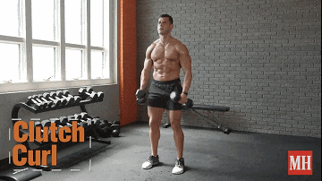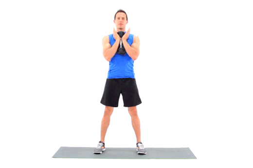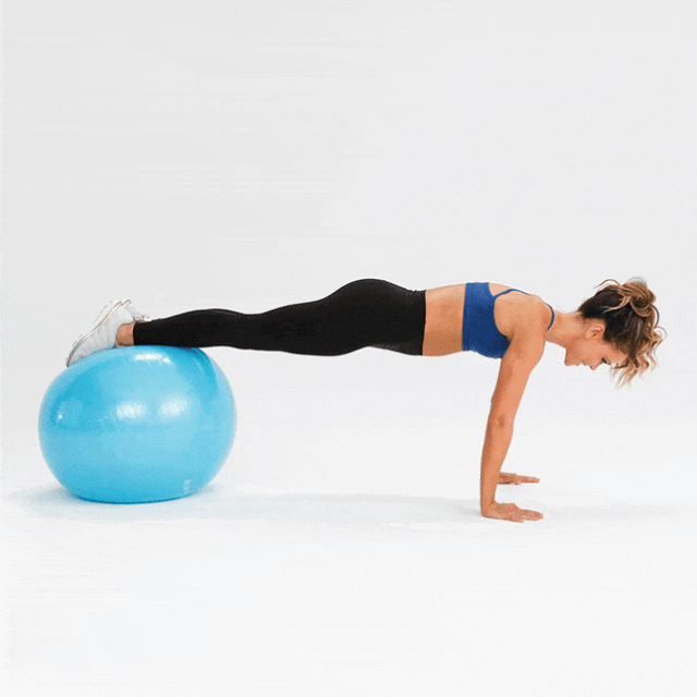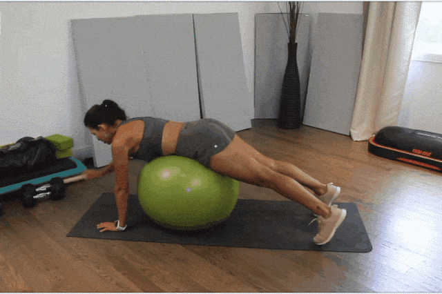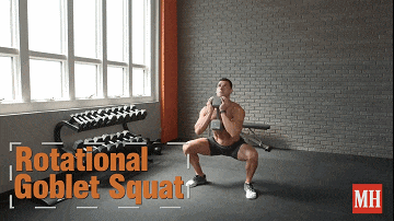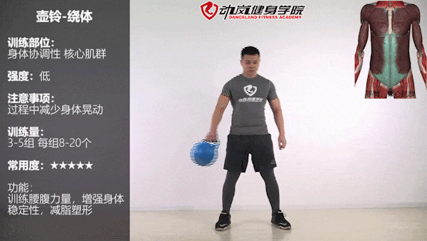 第一组动作:高脚杯深蹲转体 + 瑜伽球折刀 + 哑铃交替弯举 + 壶铃绕圈