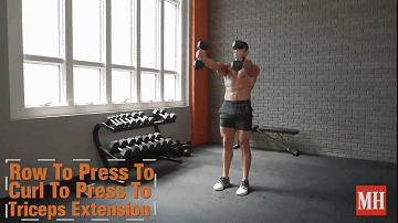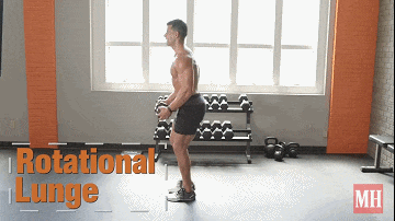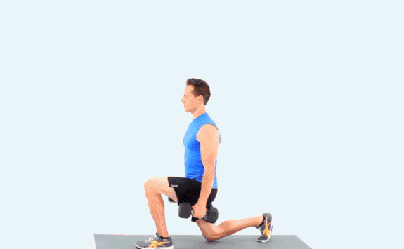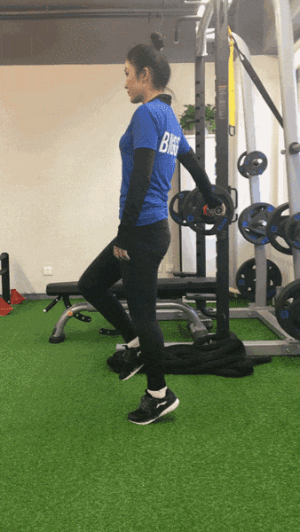 第一组动作:哑铃深蹲 + 杠铃硬拉 + 哑铃交替前弓步