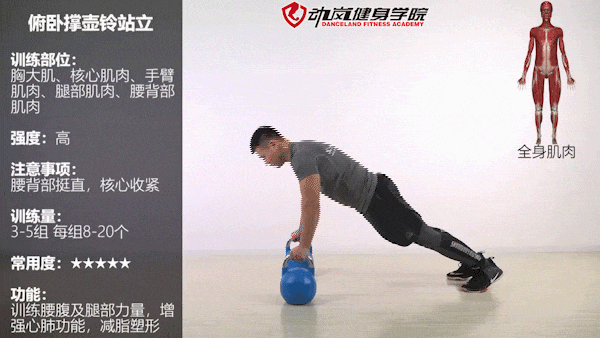 第四组动作: 哑铃水平旋转 + 瑜伽球对侧两头起 + 哑铃火箭推 + 俯卧撑壶铃站立