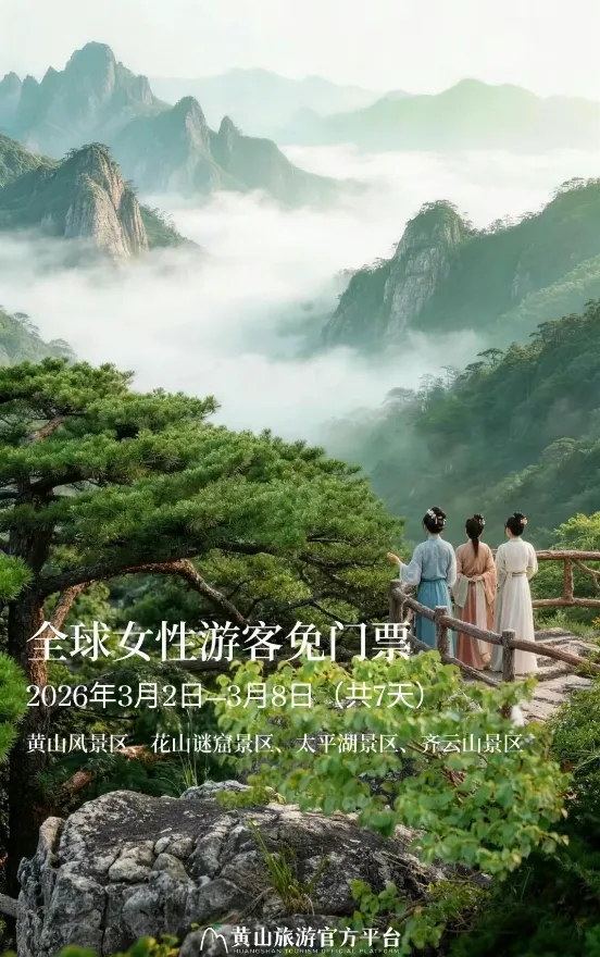 三月黄山,云海为裙,山花作簪。恰逢国际劳动妇女节,黄山风景区携手齐云山等景区向全球女性发出邀约!全球女性专属免门票活动时间为2026年3月2日至3月8日(共7天),免票门票景区包括黄山风景区、花山谜窟景区、太平湖景区、齐云山景区(含逍遥街)。