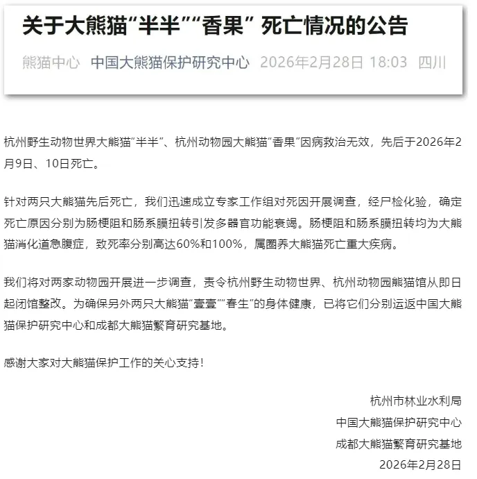 2月28日,中国大熊猫保护研究中心发布公告。杭州野生动物世界大熊猫“半半”、杭州动物园大熊猫“香果”因病救治无效,先后于2026年2月9日、10日死亡。经尸检化验,确定死亡原因分别为肠梗阻和肠系膜扭转引发多器官功能衰竭。