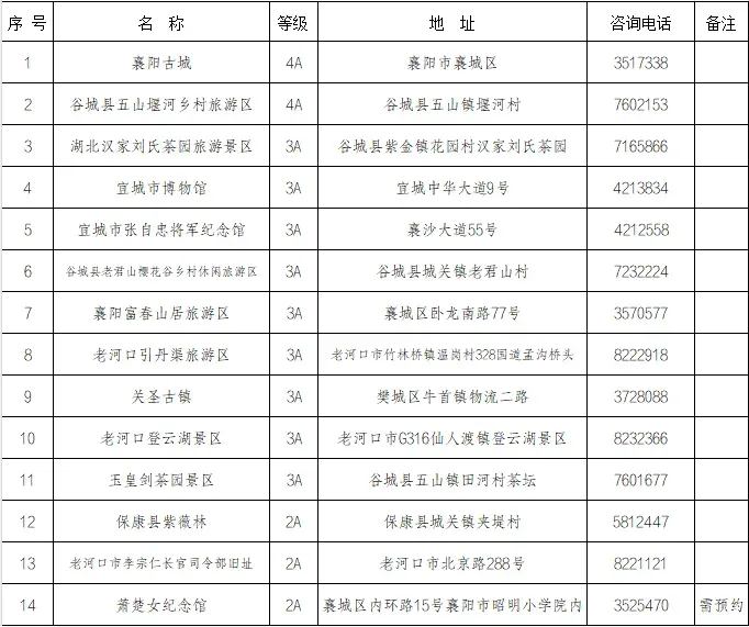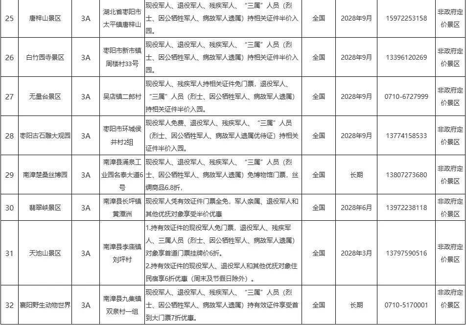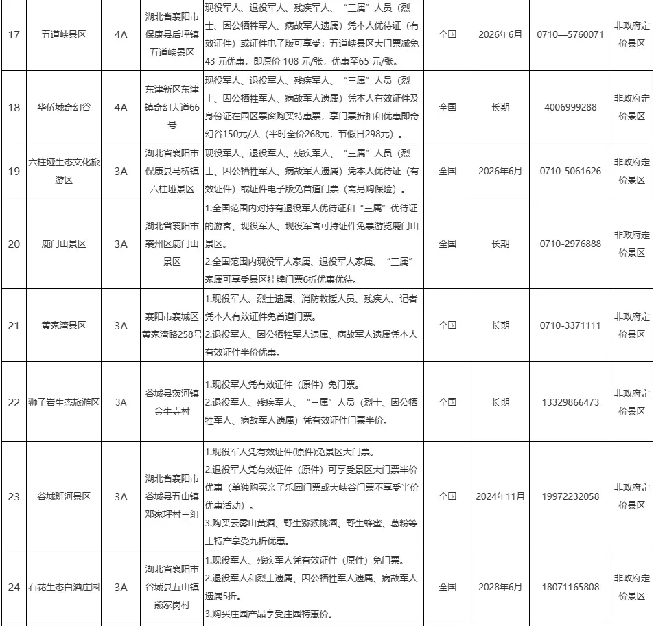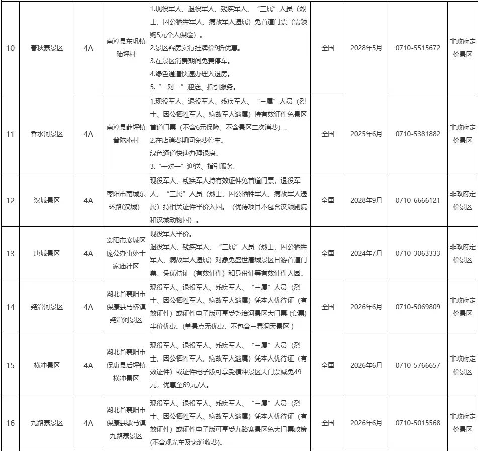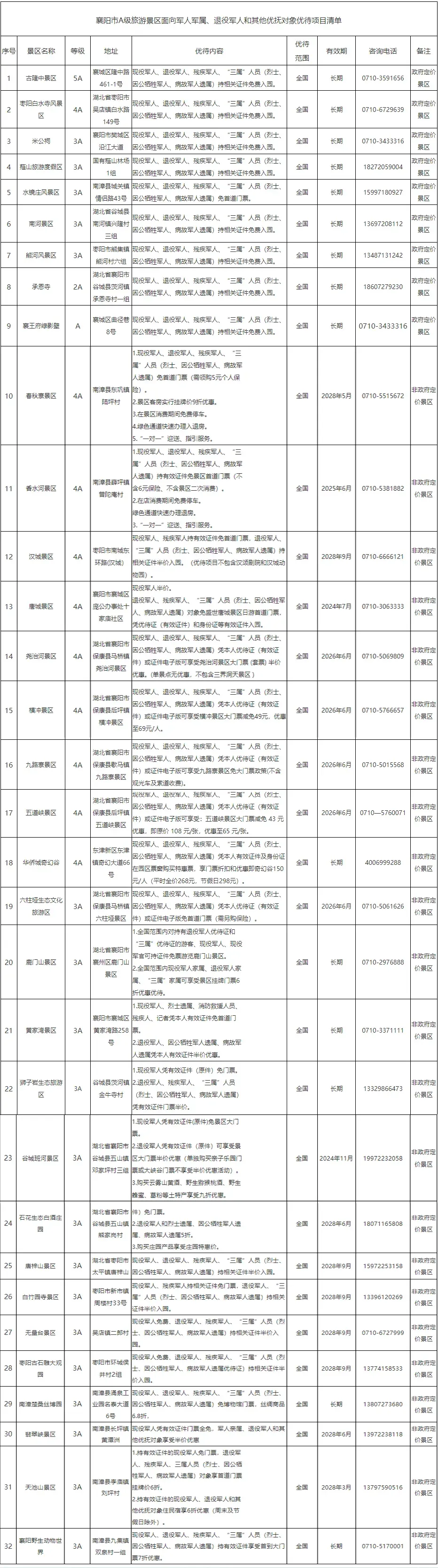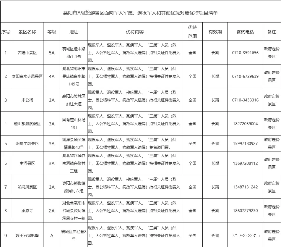 襄阳市A级旅游景区面向军人军属、退役军人和其他优抚对象优待项目清单