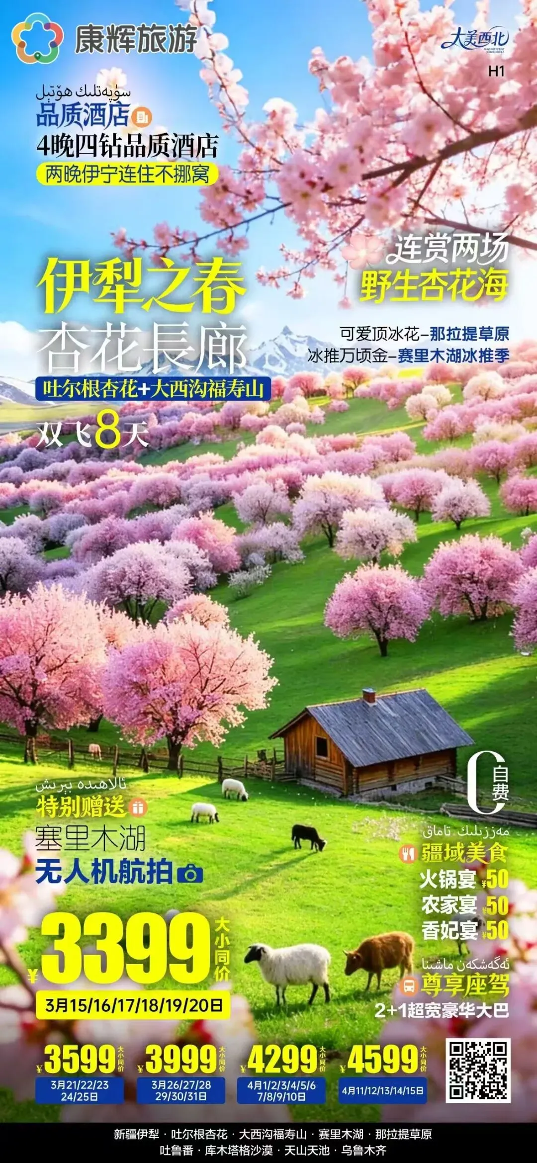 🌸 吐尔根 3 万亩野杏林、大西沟 40 万株野杏花海,600 里杏花长廊震撼人心✨ 0 自费,2+1 超宽豪华大巴,4 晚四钻酒店 + 2 晚伊宁连住不挪窝!
