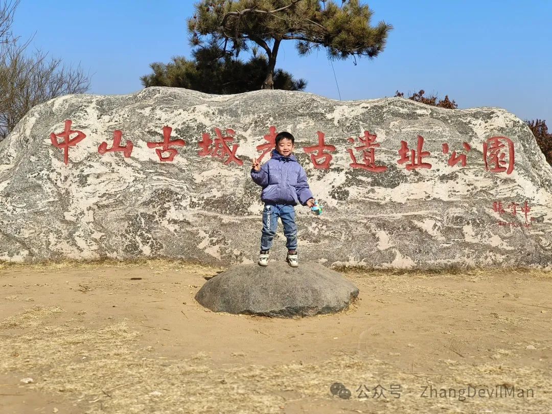 停车场与入口之间有一块巨石,两面分别用不同字体写了“中山古城考古遗址公园”。
