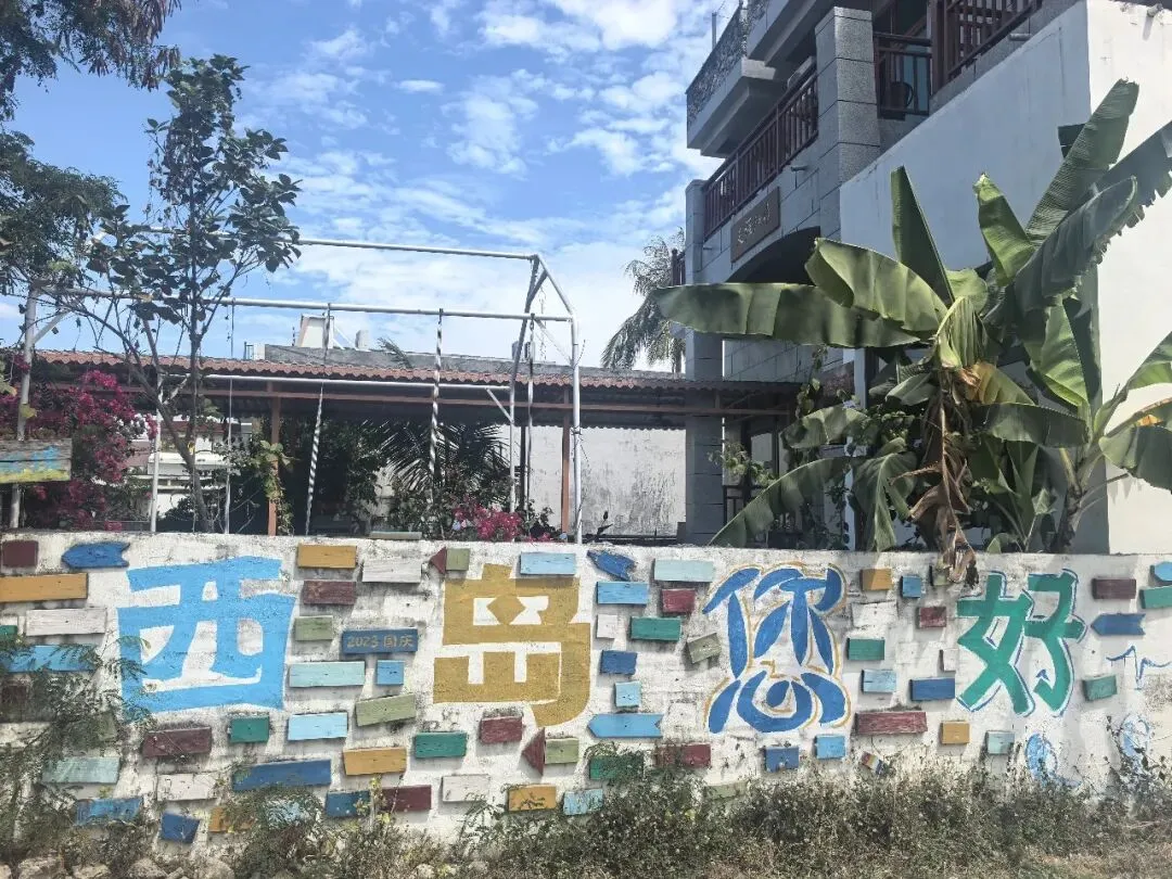 我在岛上自由行走的时候,看到岛上有个樊登书店。这是一间老屋,迎风飘扬的白色布条就像帆船一样,旁边还有个樊登书店文创馆,小院门口种的三角梅绽放着迎接祖国各地来西岛的游客。 我还听到了乡音,感觉特别亲切。 我和NEVER打卡了海滨浴场、歪脖子树、珊瑚墙、爱心墙、网红虾饼老店、孤独的树、渔村码头、女民兵纪念馆、牛王岭、海南农商银行等等。